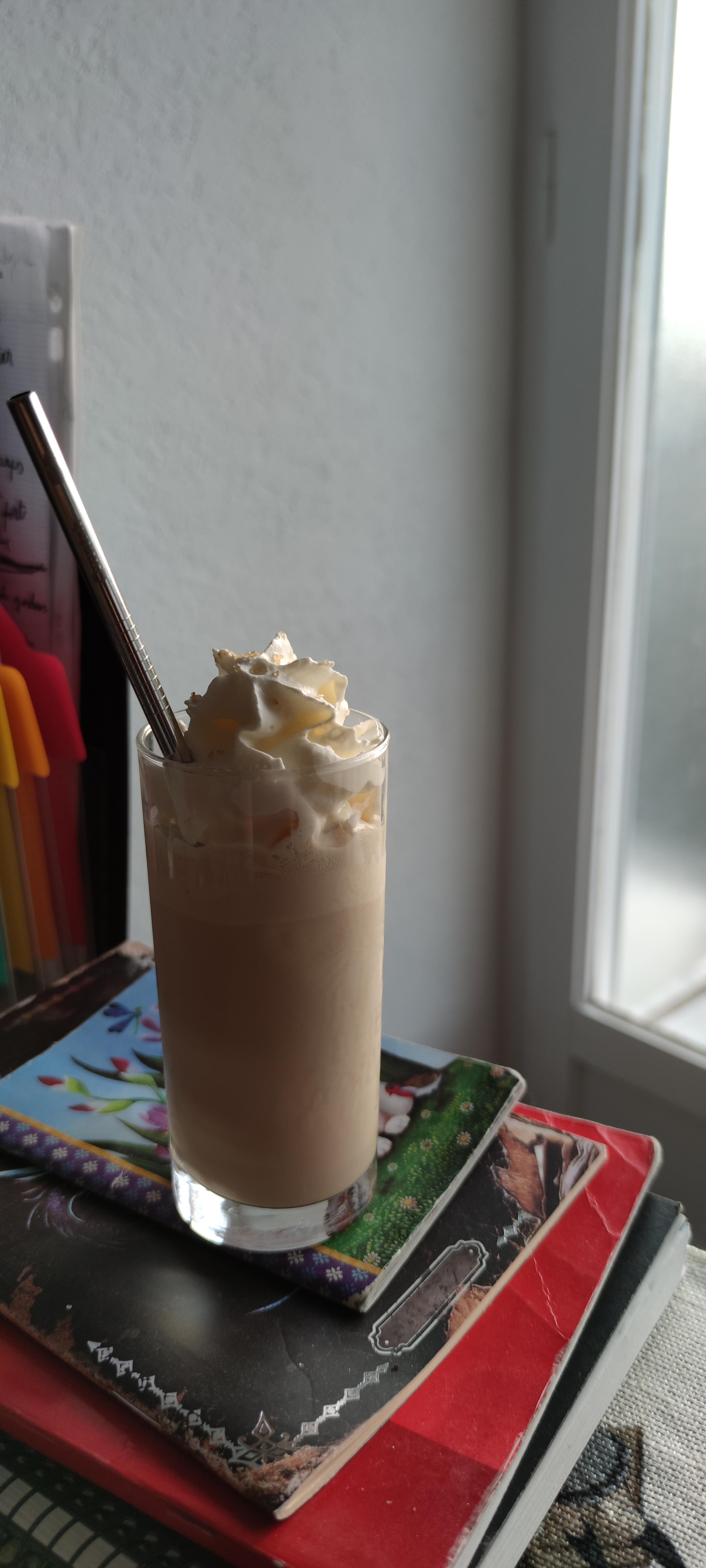Bein j’ai fait un milkshake donc j’ai dosé au pif (enfin sans mesure quoi) lait entier, crème et glace que j’ai mixé et j’ai goûté jusqu’à ce qu’il y est un équilibre d’ensemble. Enfin j’ai mis un peu de sucre de canne (sur la chantilly aussi). Franchement j’ai jamais bu meilleur milkshake que ceux que je fais avec mes mimines.