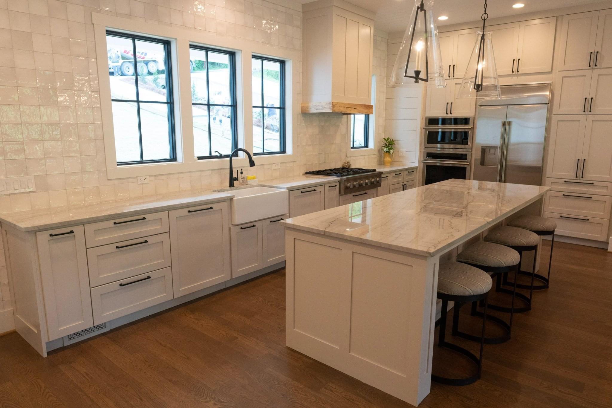 Wow, a white shaker kitchen with white tile, marble counters, black hardware, and an apron sink. There’s even some shiplap and a natural wood detail on the range hood. It’s just *so* original.