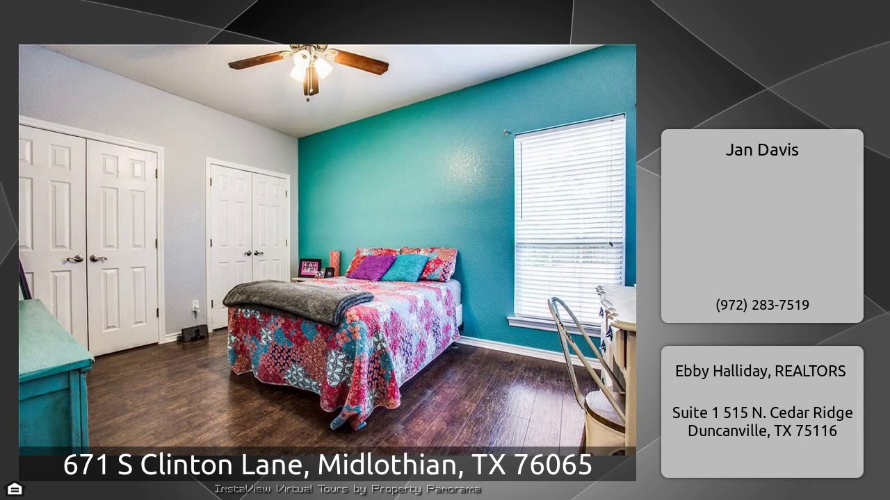 The Virtual Tour for the property at 671 S Clinton Lane, Midlothian, TX 76065 listed for $396,000: Other homes for sale by Jan Davis of Ebby Halliday, REALTORS: Room to roam on over 2 acres…this one owner home tucked back near a creek will amaze*Sparkling saltwater pool with covered patio is fenced with iron to showcase the heavily wooded lot*Den boasts tiled floors plus French doors to the pool*Formal dining, study, & one bedroom feature wood floors*Ample kitchen with stainless double ovens, breakfast bar, & center island*Private master with garden tub & dual dressing areas*Two split …