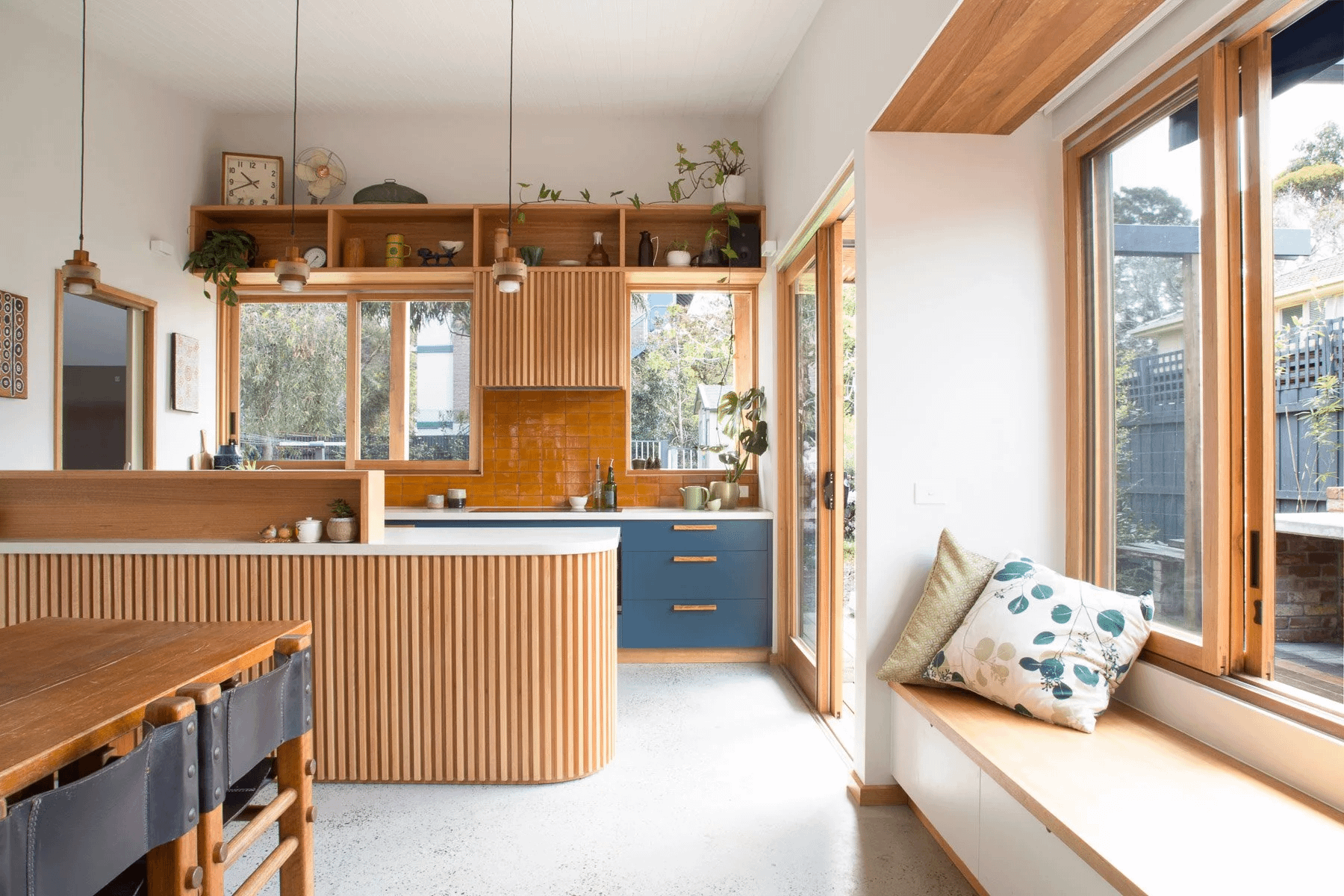 Kitchen and dining space with a window seat in a renovated and extended bungalow, Brunswick West, Melbourne, Victoria, Australia. Credit to u/maniaforbeatles