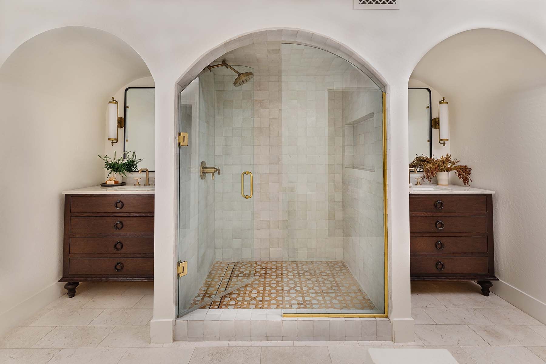 Arched vanity nook on both sides of a shower in a Spanish Revival residence, Scottsdale, Arizona [1800×1200]