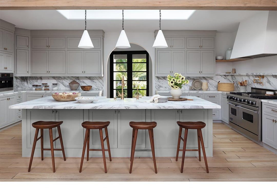 Design render of a kitchen with marble backsplash under a skylight by STUDIO LIFE/STYE Los Angeles