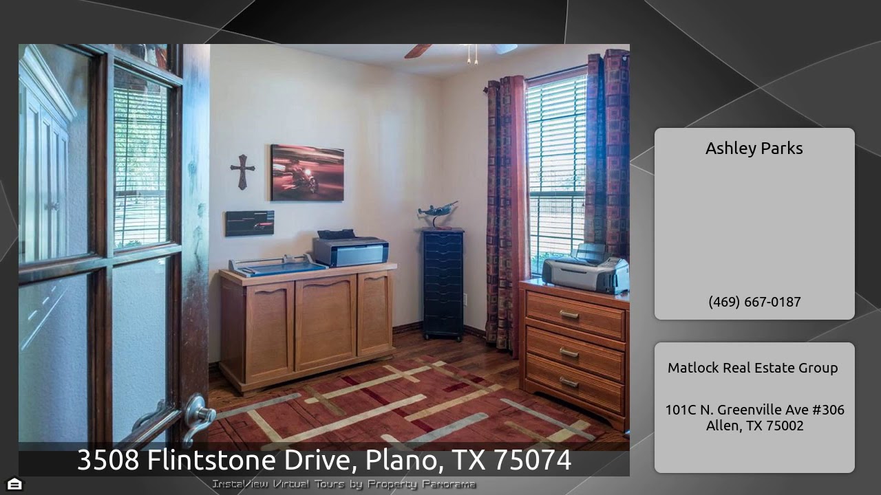 The Virtual Tour for the property at 3508 Flintstone Drive, Plano, TX 75074 listed for $599,000: Other homes for sale by Ashley Parks of Matlock Real Estate Group: 2 ACRE lot in Plano. NEW IN 2018 hot water heaters, 3 AC units, roof and exterior paint. Beautiful stone and brick home nestled among mature trees on a sprawling lot. Perfect for entertaining with large kitchen open to cozy den and French doors leading to expansive covered patio with gas fire pit. Off the beautiful entry is a dining room, large living space and staircase adorned w iron railings. Secluded master suite with walk …