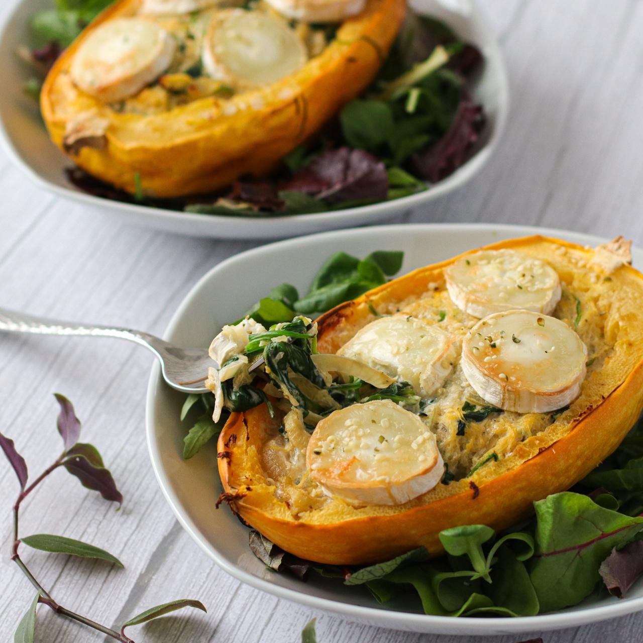 Mettez les spaghettis dans la poêle avec les épinards à la crème, mélangez bien puis mettez cette préparation à nouveau dans les courges.