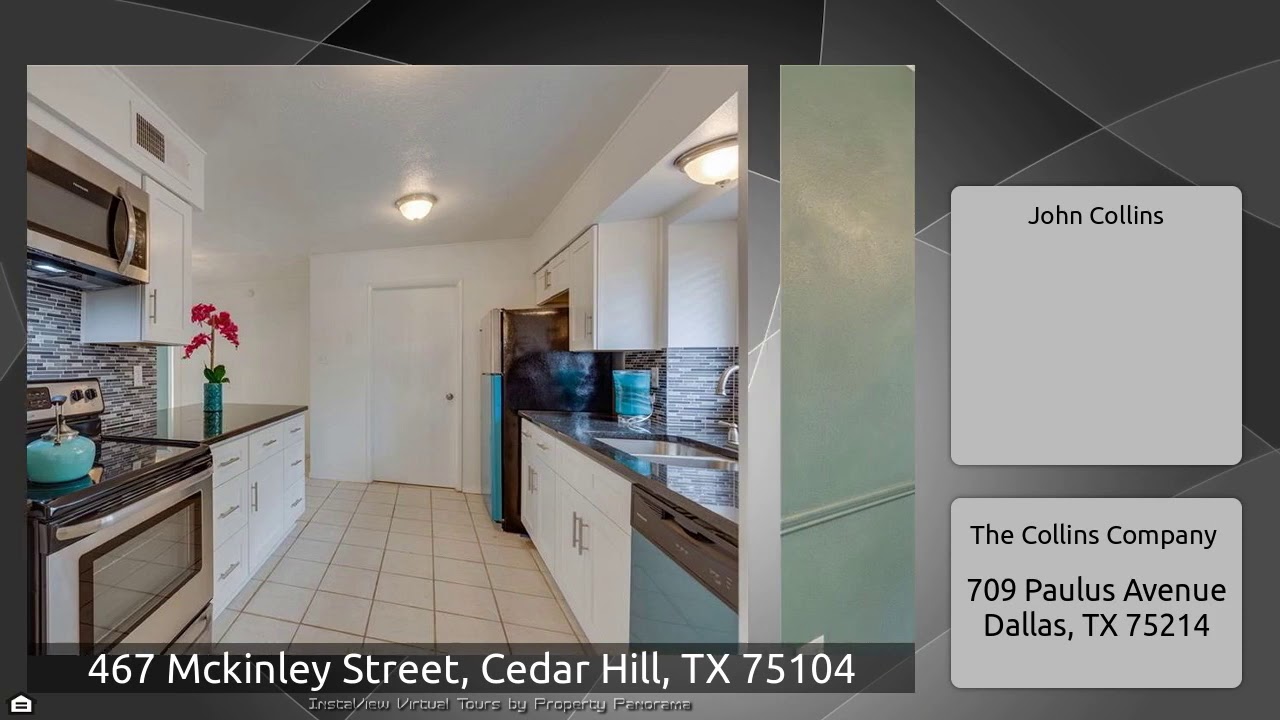 The Virtual Tour for the property at 467 Mckinley Street, Cedar Hill, TX 75104 listed for $219,500: Other homes for sale by John Collins of The Collins Company: PRICE REDUCTION! Walk into an open, spacious, lovely home with a sunken living room with fireplace & wood floor to your left and a wet bar showcasing beautiful wall tile to your right. The 2nd living area, great for lounging, has French doors that opens to the patio and pool area. Remodeled kitchen flaunts granite counter tops, wall tile, and new stainless-steel appliances. Dining and living room exhibit stunning lighting. Nice …