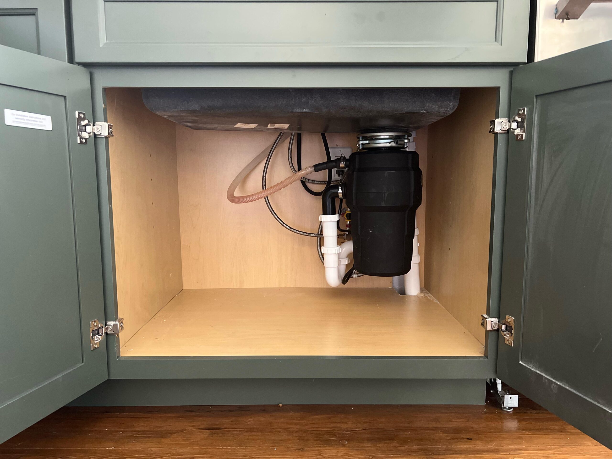 Our old kitchen had the disposal and plumbing installed dead center inside the cabinet. No room inside for any kind of pullout storage at all.