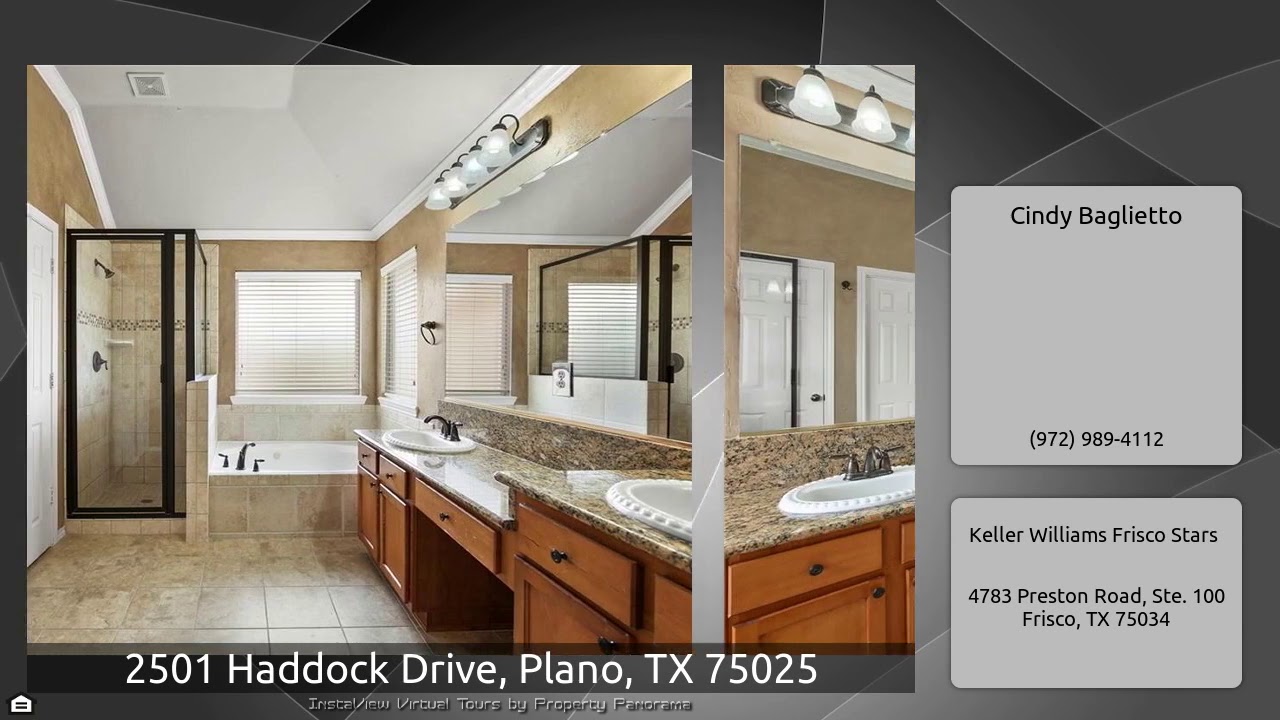 The Virtual Tour for the property at 2501 Haddock Drive, Plano, TX 75025 listed for $415,000: Other homes for sale by Cindy Baglietto of Keller Williams Frisco Stars: Large corner lot with mature trees. Extensive nailed down hardwood floors thru entry, hallway, formal dining & living, family & study. Split formal areas on each side of foyer with arched entries. Stunning wood staircase w iron balusters & fresh paint. Study has French doors and ceiling fan; family room has gas log FP with wood mantle & wall of windows overlooking the backyard. Kitchen features granite counters, travertine …