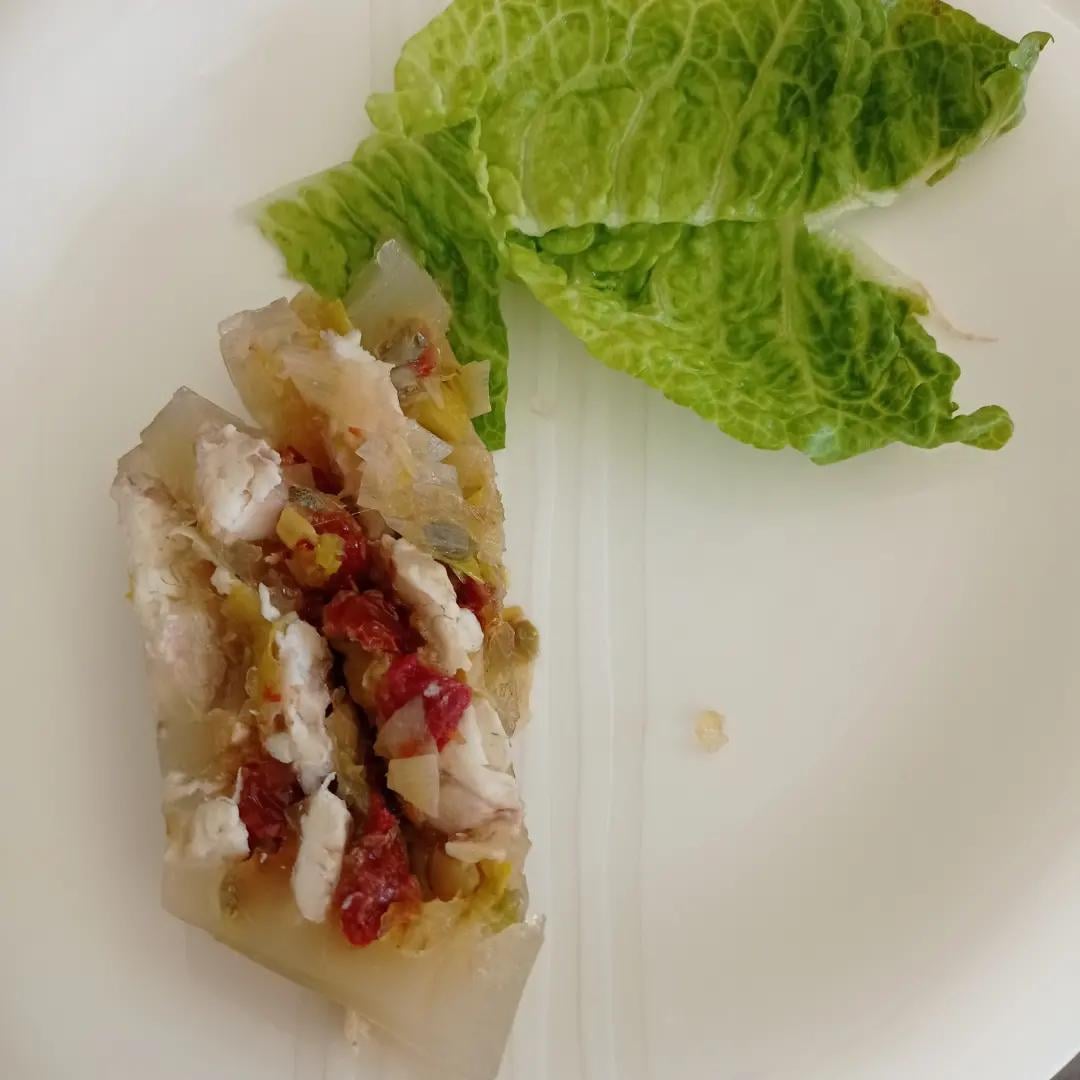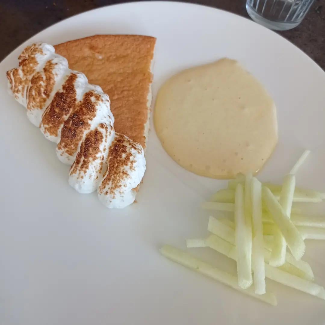 Terrine de bar, spaghettis gorgonzola et biscuit Joconde, sabayon cognac julienne de Granny Smith