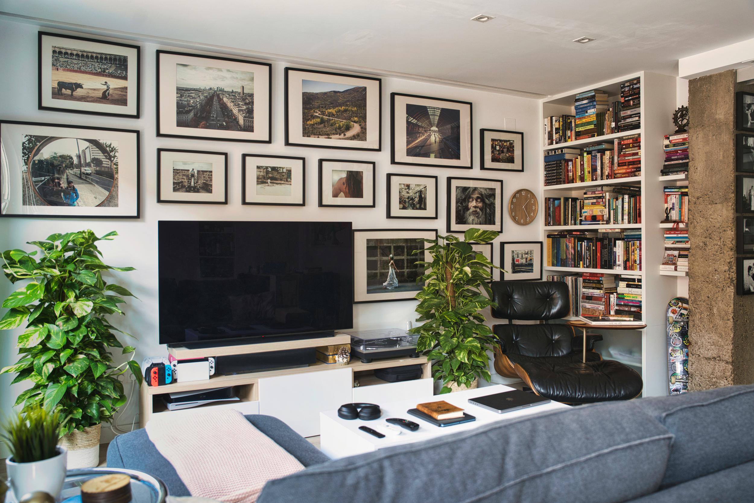 I think the gallery wall could do with a few vertically orientated pictures to break up the pattern. Having all pictures in horizontal orientation looks a bit odd to me.