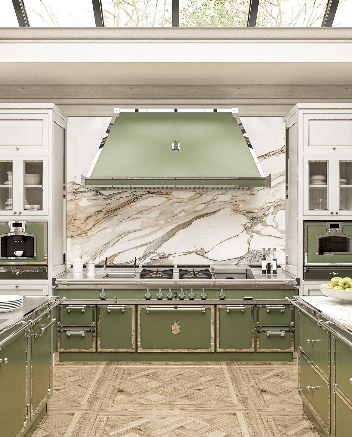 It’s taking chances with a non-standard kitchen look. Colors of the appliances pulled throughout the room. Colors of the wood floor and cabinets echoed in the marble slab, which has an interesting pattern. The interesting floor square pattern is ‘almost’ centered to the range (it’s slightly too far to the right), but that would be asking for too much in an already really well-thought out design. Stainless steel accents within the cabinet door profiles (and around the slab/hood), which are also carried throughout the room. Skylights in kitchen show hints of the green foliage (which may be why the designer chose to go with green in the kitchen). Another minor nitpick; I’d have avoided the crown molding on the walls, and taken the cabinets/hood to the ceiling soffit. Avoid the dead space above the cabinet. LOL at all the commenters in this thread dogging on this. Would love to see their crate and barrel dream kitchen.