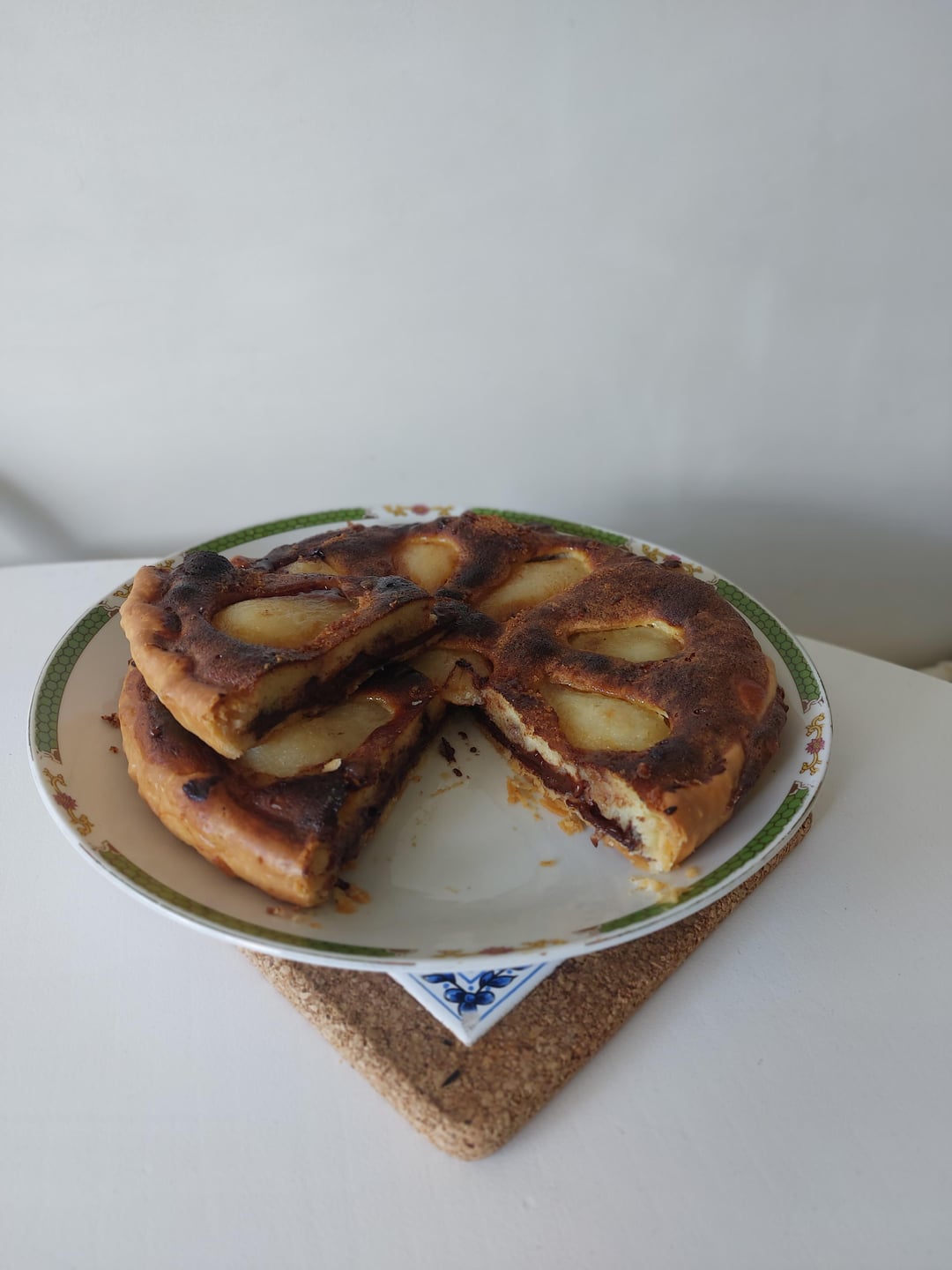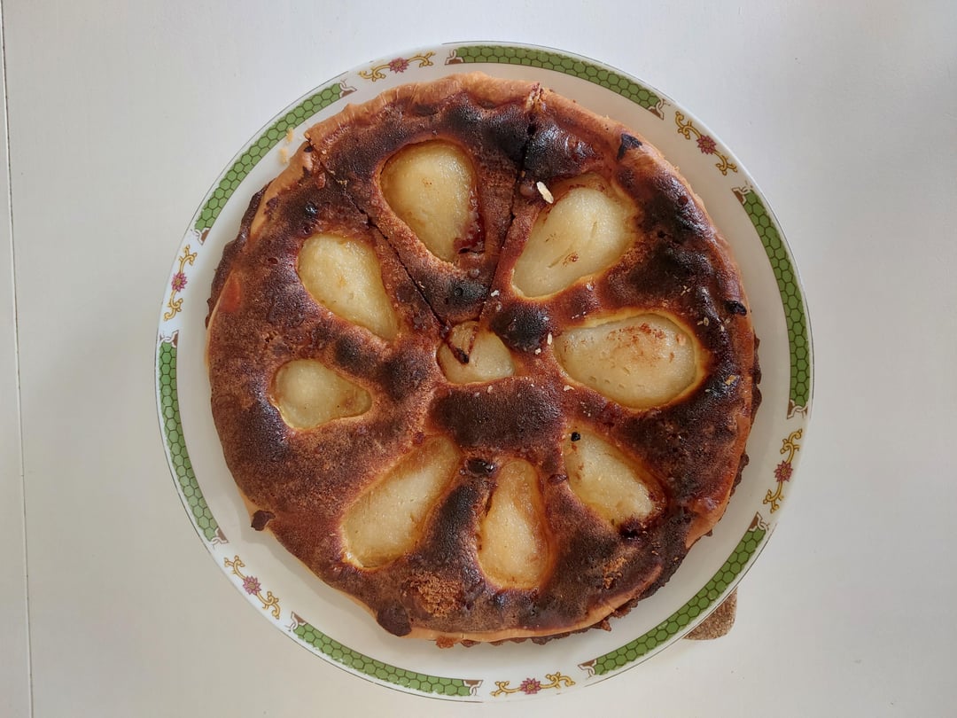 Ajouter les poires (personnellement plus il y en a mieux c’est) puis ajouter doucement le mélange œufs/crème.