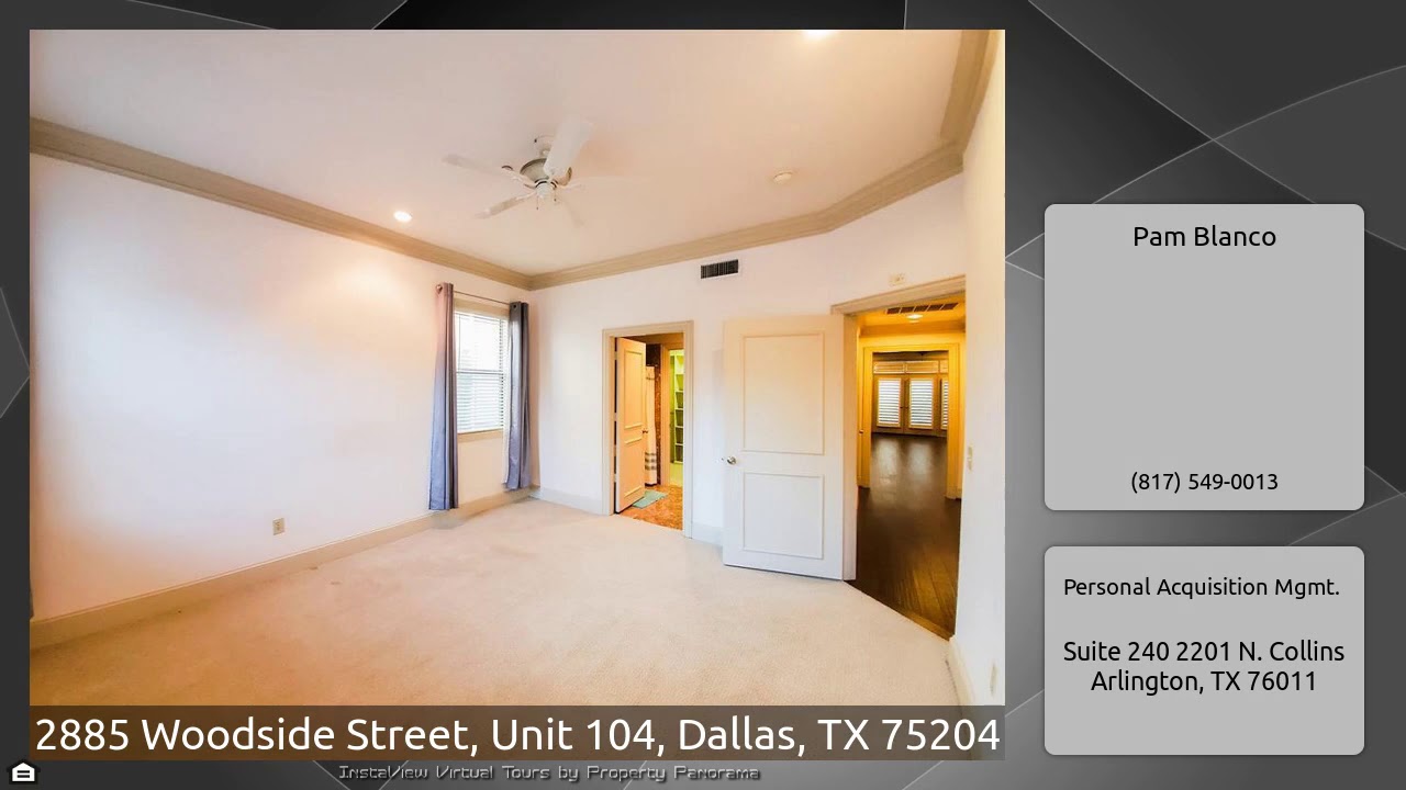 The Virtual Tour for the property at 2885 Woodside Street, Unit 104, Dallas, TX 75204 listed for $410,000: Other homes for sale by Pam Blanco of Personal Acquisition Mgmt.: Beautiful condo in the heart of State-Thomas neighborhood of Uptown overlooking pool and courtyard. Semi-private elevator takes you to your elegant condo featuring a gourmet kitchen with granite counters, SS appliances, five-burner gas cook top and wine fridge. Dbl French doors open to the private urban oasis. Wood floors, 10 ft ceilings, triple crown moldings, security system and luxury master suite with jetted tub and …