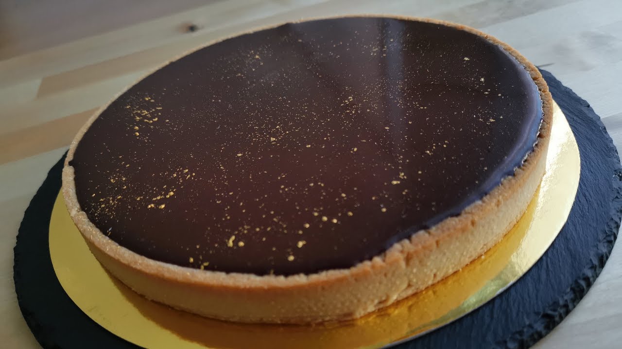 14. For the assembly, pour the chocolate cream until it reaches ¾ of the tart’s height. Let it cool in the fridge 10-15 minutes. Pour the glaze when it cools down to 95-100.5°F (35-38°C). Sprinkle with golden powder.