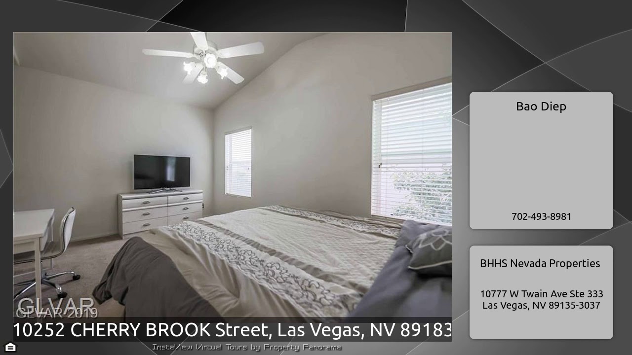 The Virtual Tour for the property at 10252 CHERRY BROOK Street, Las Vegas, NV 89183 listed for $290,000: Other homes for sale by Bao Diep of BHHS Nevada Properties: Hidden gem in the Silverado community! gated with community pool! Modern touch with upgraded flooring! Kitchen granite countertops and backsplash! Spacious open ceiling living room overlooked by upstairs loft with closet. Double french doors!!!! off formal dining room lead to backyard. This is a must see!
