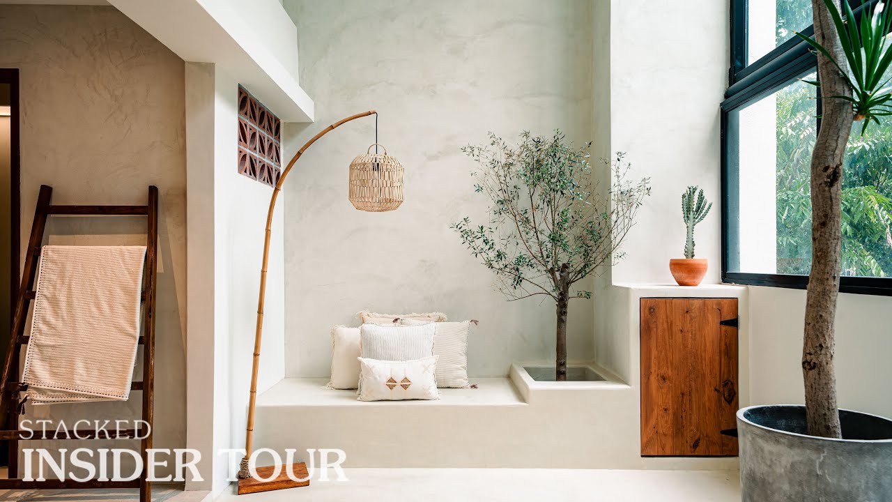 Upstairs, we find 3 bedrooms. One is currently used as storage, while the other serves as a cat sanctuary for the homeowner’s 2 felines. The common bath here is finished in a salt-pink tone, featuring circular elements that help to break the rigid textures.