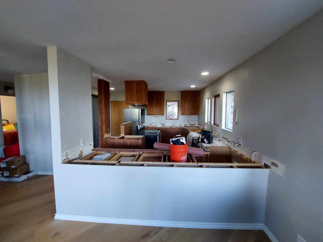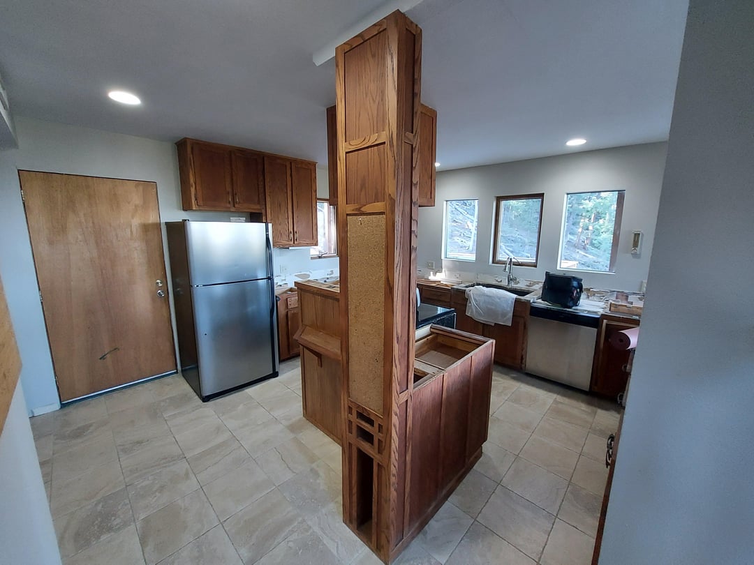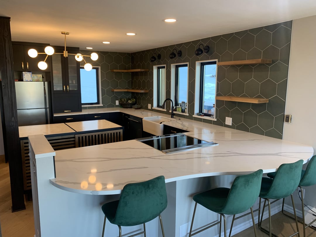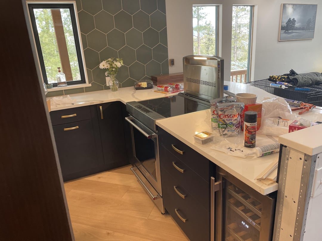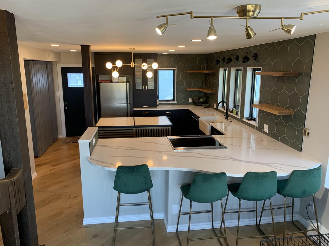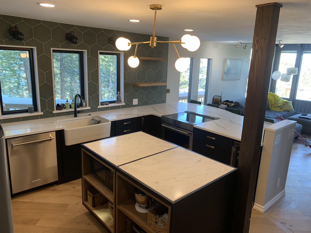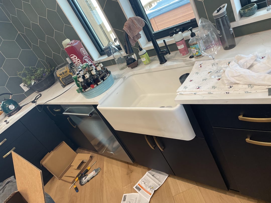 Great renovation! That support beam hurts my soul, but unless you want to renovate the ceiling too, it’s there for the long haul. Otherwise love the sink and countertops.