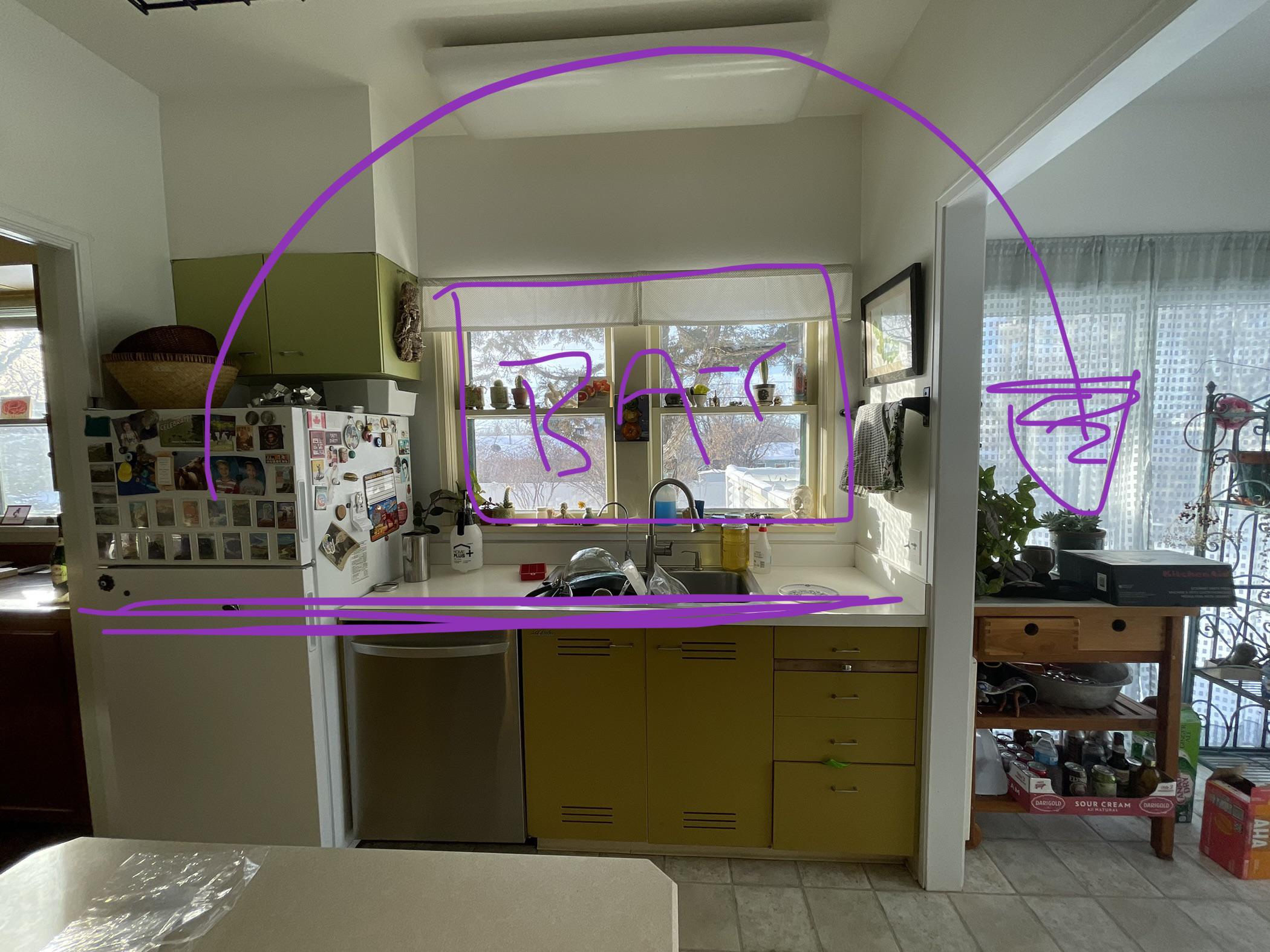 Redoing this little part of kitchen. Mostly because I want a bigger fridge. The plan is to move the fridge to the sunroom and extend the counter across the whole space. We plan to leave the space open under the counter for the trash. I would love a one piece stainless sink/counter combo.