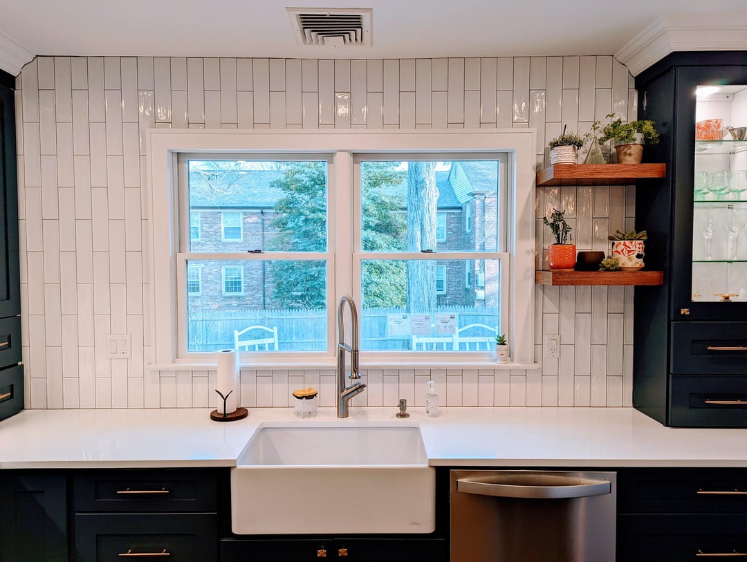 This is amazing. Love the corner shelves and breakfast nook, and the curtains in the nook! Amazing backsplash along the sink-sided counter. I just finished kitchen reno; such terrible work! Good job here!