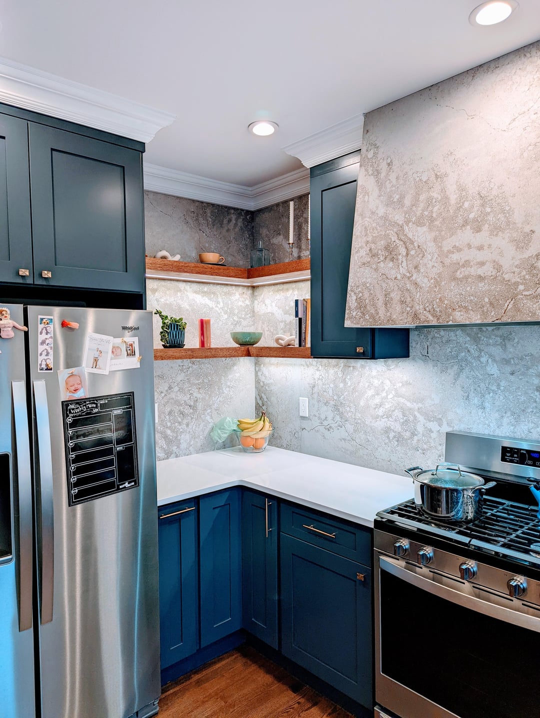 The shelving is cool because I was worried our kitchen would look too sterile and cold(we have a blue and white tile) but they really warm the space up.
