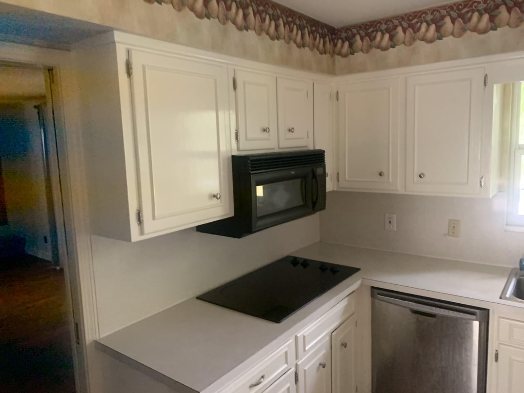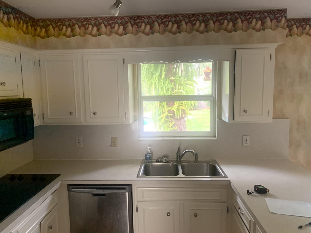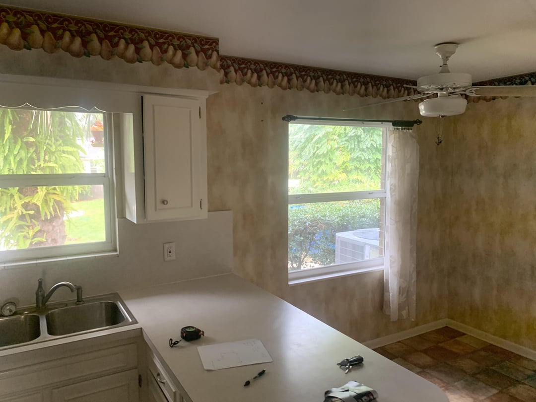 1. Remove everything, flooring, cabinets, and appliances that don’t work (stovetop and microwave), and anything beige.