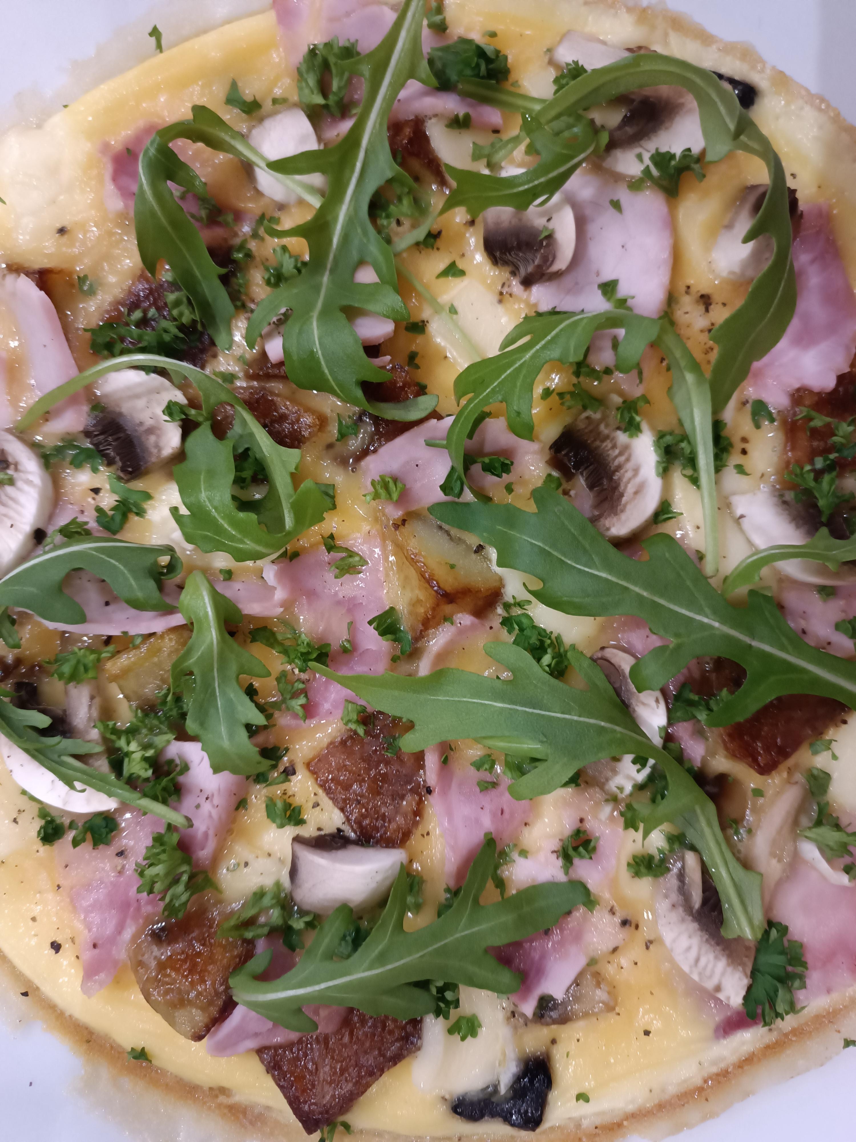 Mwakay 3 years ago Champignons, oignons, roquette… j’oublie un truc ? Ca a l’air super en tous cas, moi qui merde la cuisson deux fois sur 3 je suis jaloux !