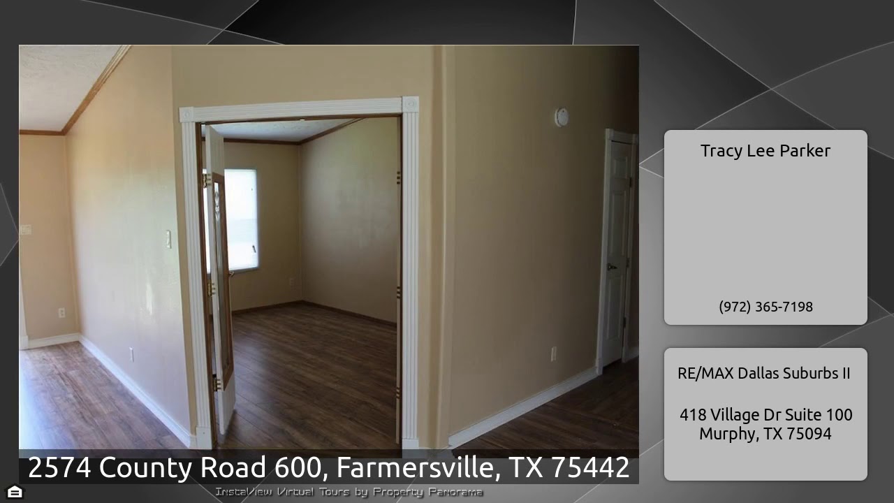 The Virtual Tour for the property at 2574 County Road 600, Farmersville, TX 75442 listed for $1,295: Other homes for sale by Tracy Lee Parker of RE/MAX Dallas Suburbs II: Very nice & clean 3 bedroom 2 bath home on 1 acre with formal dining area. Sheetrocked walls and newer laminate flooring throughout! Has a study with French Doors too or could be a 4th bedroom if needed. Split master with garden tub and separate shower. Chain link fenced back yard, wood back deck, central heat and air with great views! Huge walk in closets, large kitchen with dishwasher, drop in range electric oven, eating …