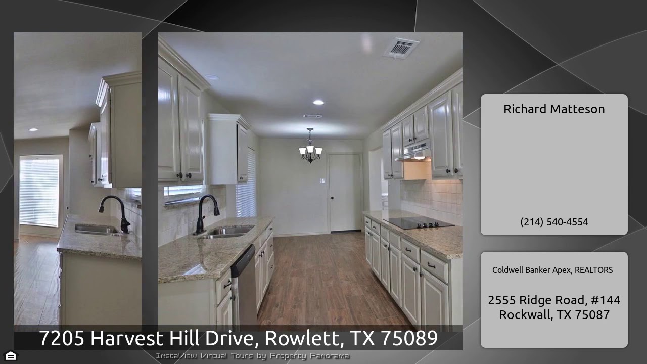 The Virtual Tour for the property at 7205 Harvest Hill Drive, Rowlett, TX 75089 listed for $235,900: Other homes for sale by Richard Matteson of Coldwell Banker Apex, REALTORS: Completely renovated with beautiful tile throughout and carpet in beds. Large dining room connected to the family room which has fireplace and wet bar. Study has French doors, big closet and back door to backyard. Kitchen has new appliances, cabinets, pantry and nice nook for breakfast table. Connects with utility room for washer and dryer. Back door puts you into rear garage. All new paint, new HVAC inside and out. …
