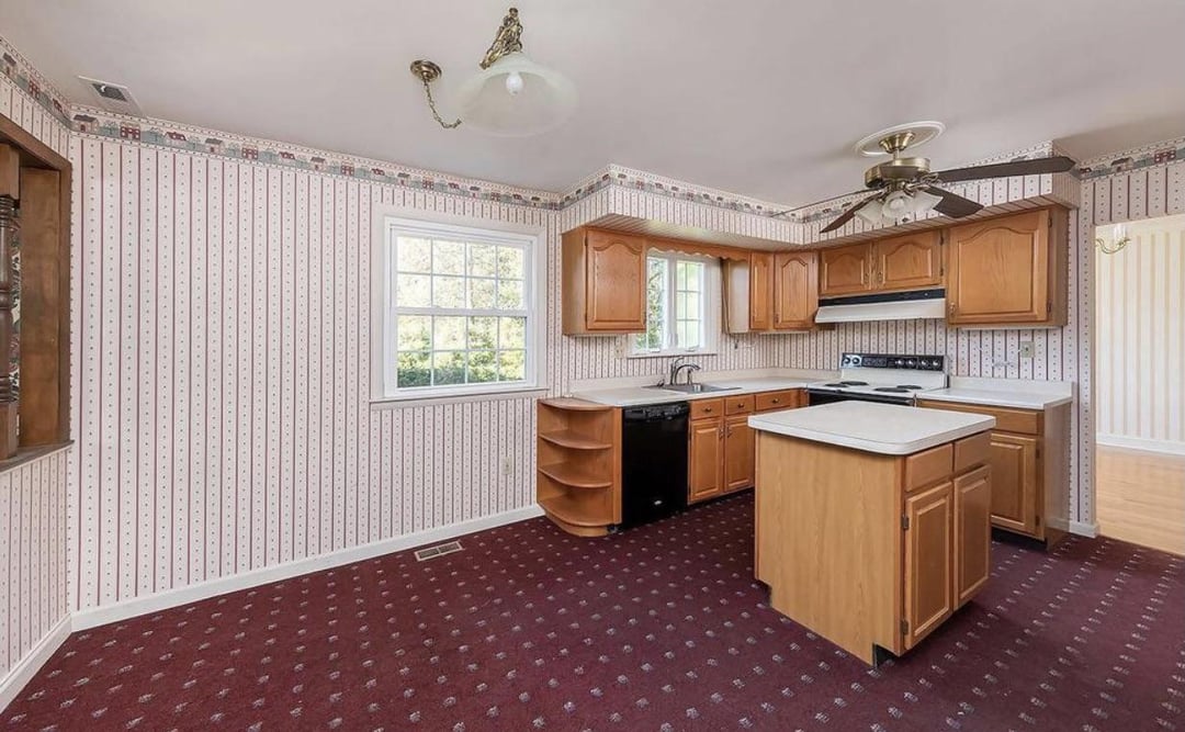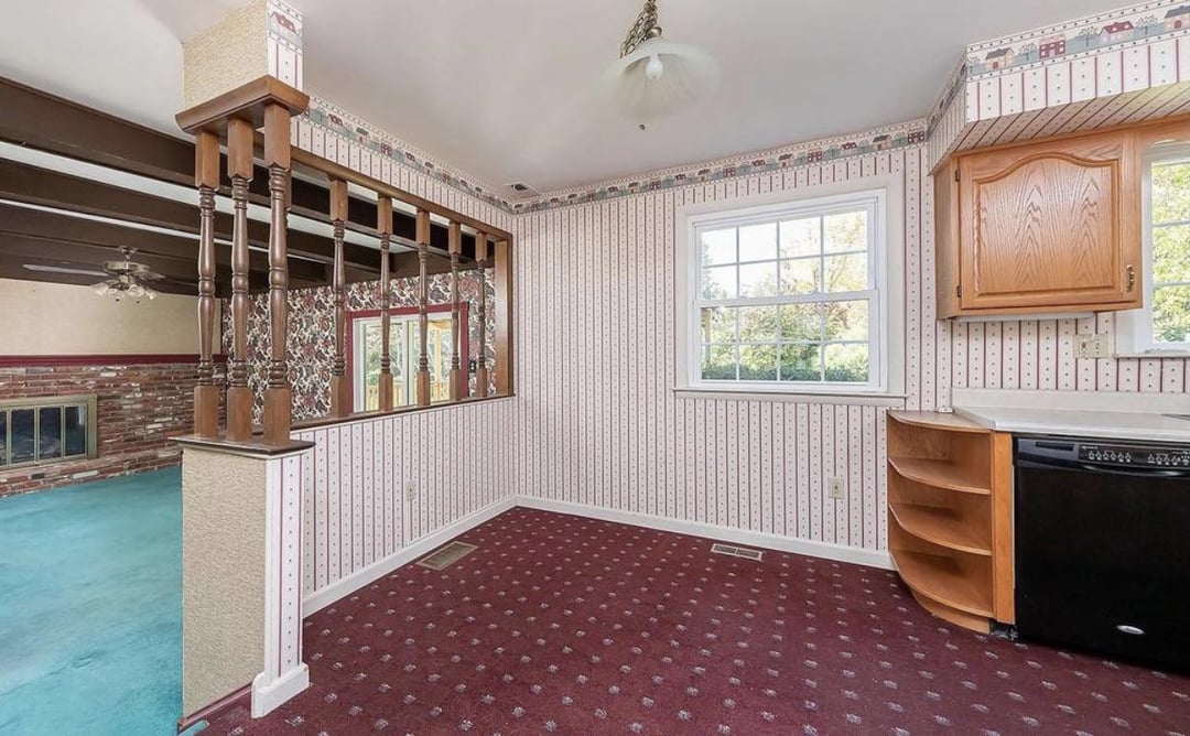 Step one is to remove the bulkhead and wood spindles going into the living room, unless you want to lean into the 70โs vibe.