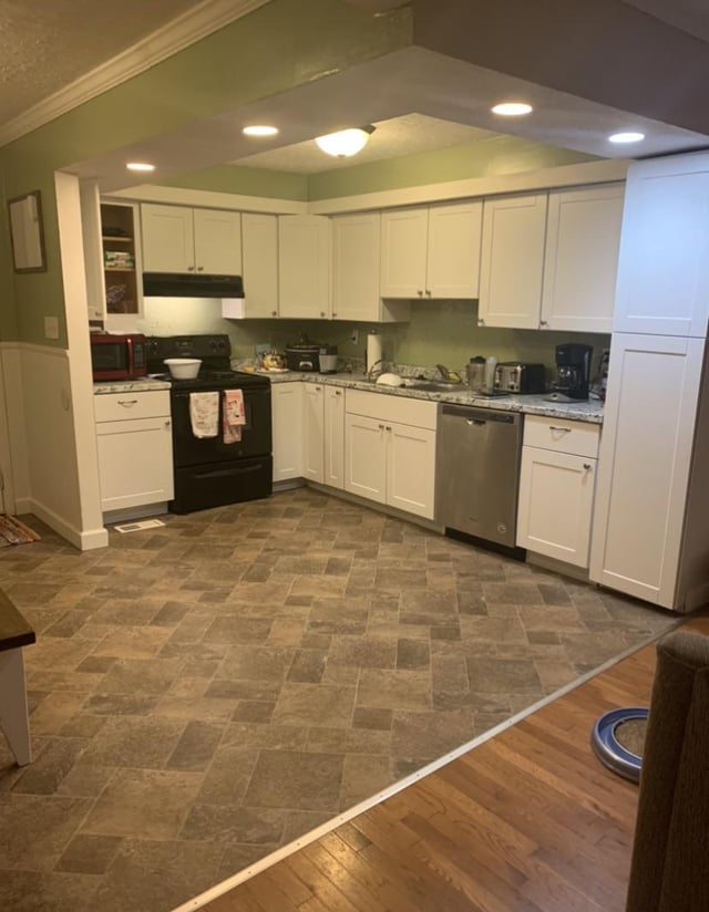 New lighting, picket backsplash, new flooring, stainless flat top range