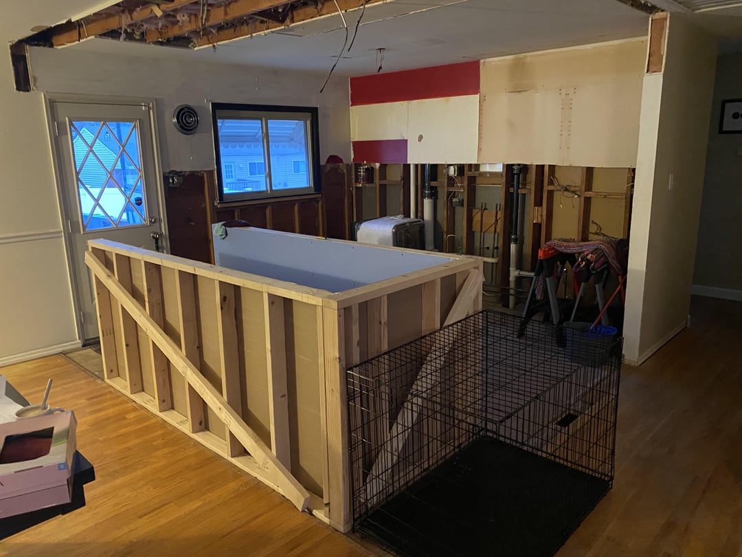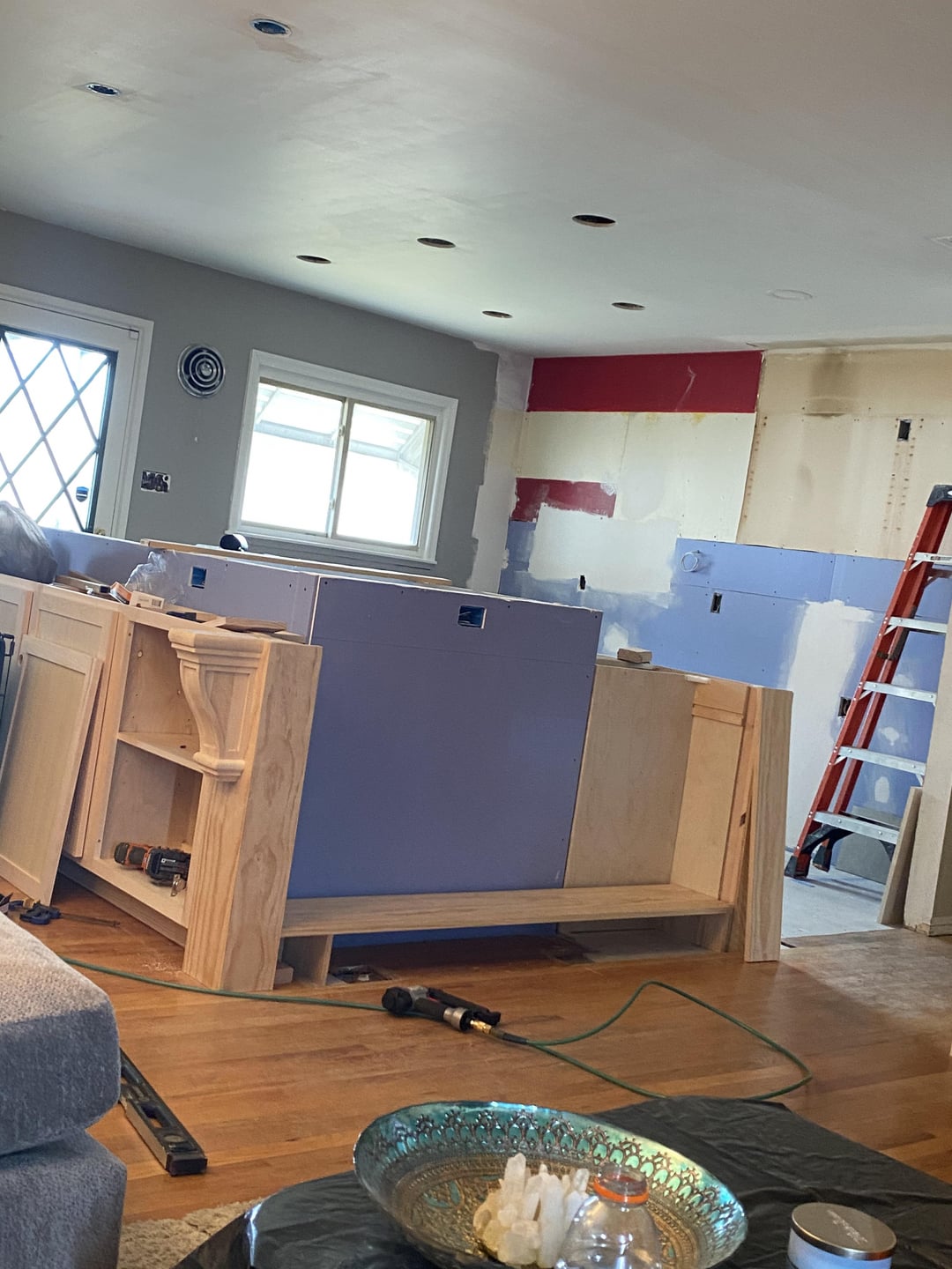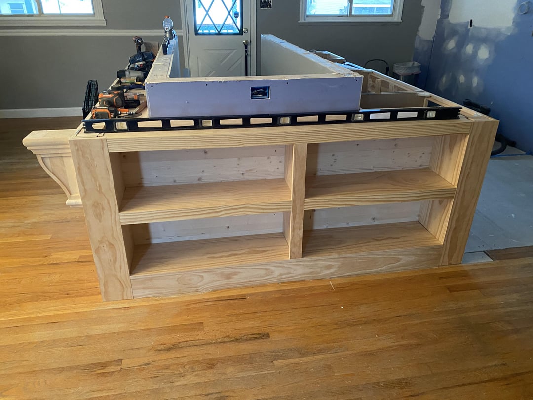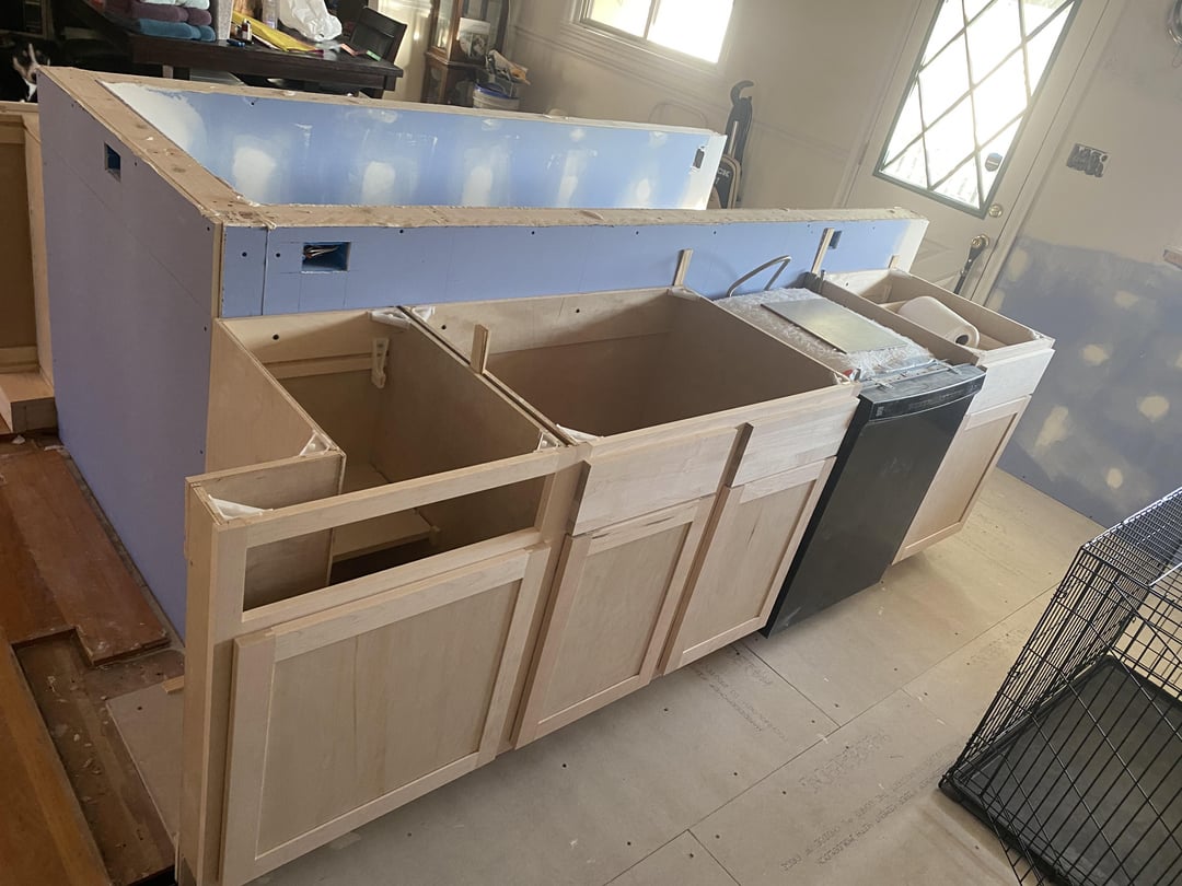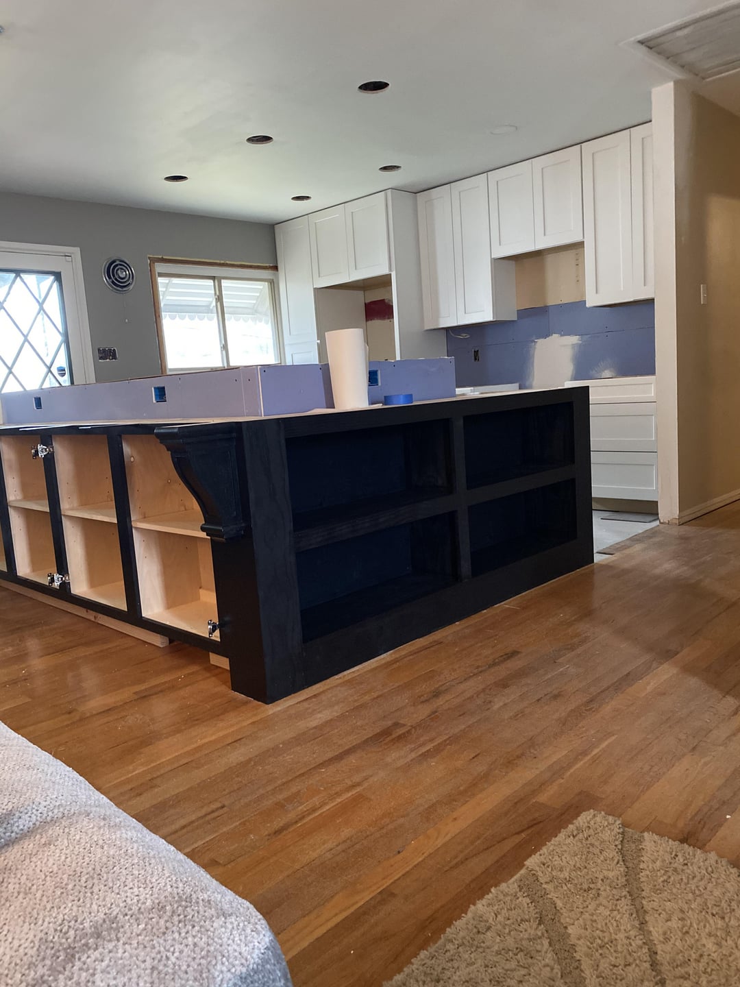 I loveee this island design, I’ve never seen this before. What a great use of space to make sure there’s an entryway for the door. I could never have open cabinets at that level though, my dogs would just be like mmm let me get a little taste of everything lol