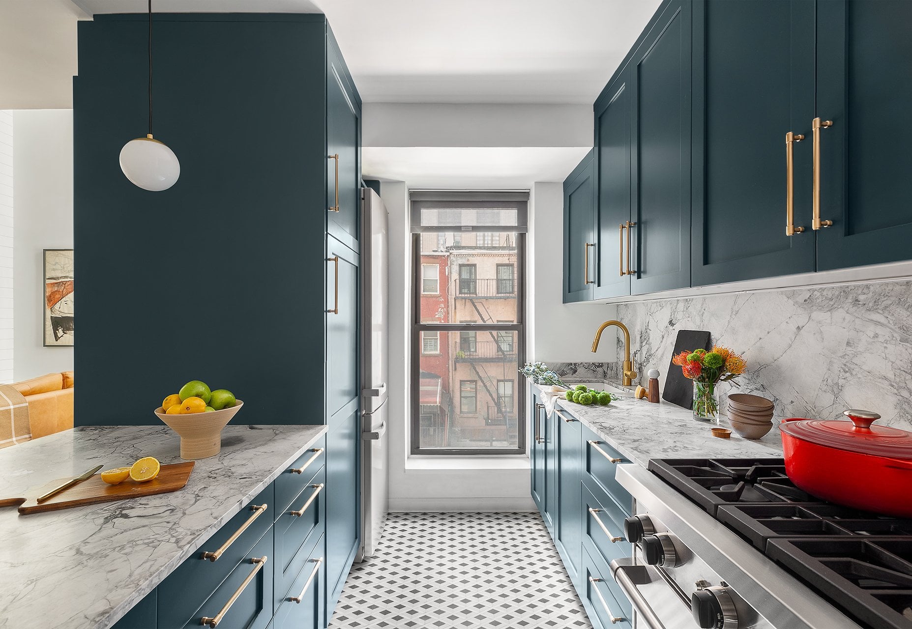 I think this would be a great little galley kitchen to work in! I know people are complaining about the view but I think the natural light is nice for a little city kitchen. Does anyone know the name of the stone used for the countertops?