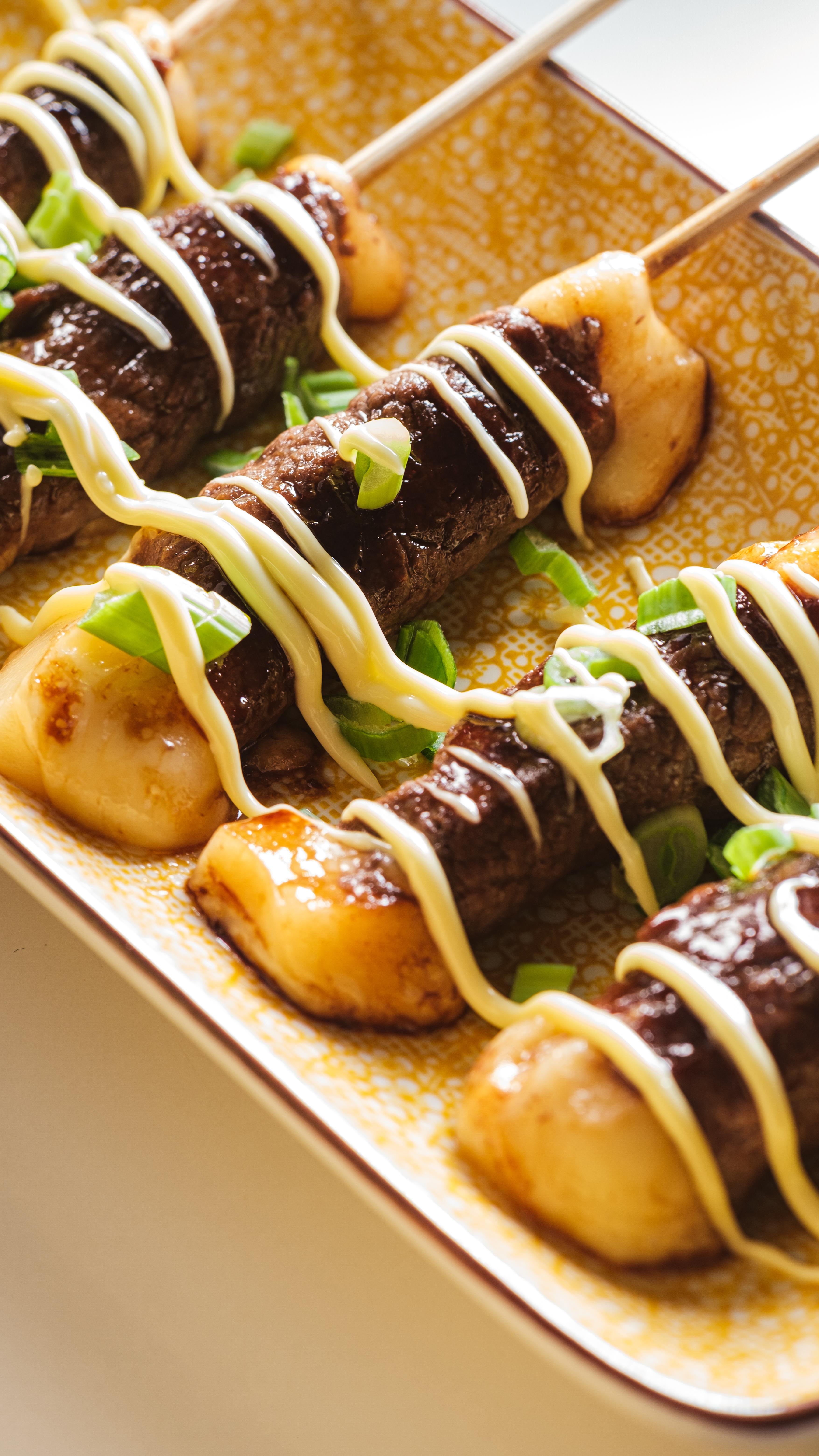9. Disposer vos brochettes dans une assiette avec un peu de cébette émincée et un filet de mayonnaise