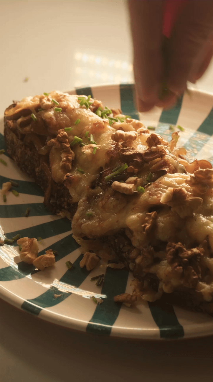 1. Couper des tranches épaisses de pain de campagne 2. Verser un filet d’huile et frotter à l’ail 3. Déposer quelques cuillères à soupes de compotée d’oignons, l’idée c’est de bien recouvrir les tartines 4. Couper des fines lamelles de champignons et les faire revenir à la poêle quelques minutes avec une noix de beurre 5. Déglacer au vin blanc 6. Ajouter les champignons sur vos tartines et recouvrir généreusement de comté râpé 7. Enfourner au four pendant 20min à 180° 8. Ciseler de la ciboulette en topping et quelques cerneaux de noix concassées 9. Bon app’