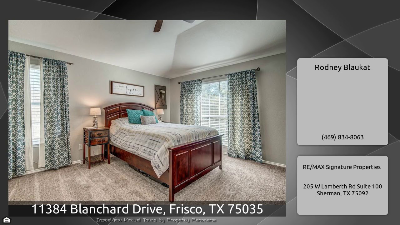 The Virtual Tour for the property at 11384 Blanchard Drive, Frisco, TX 75035 listed for $355,000: Other homes for sale by Rodney Blaukat of RE/MAX Signature Properties: Beautiful renovated home on a quiet street in exemplary Frisco ISD. Open spacious floorplan with nice flow. Impressive 2 story entry, formal dining room and study with french doors. Kitchen with an abundance of cabinets, breakfast bar, granite counters, gas cooktop, and stainless steel appliances. Kitchen opens to family room with a cozy gas log fireplace. Generous sized master suite, master bath with double vanities, …