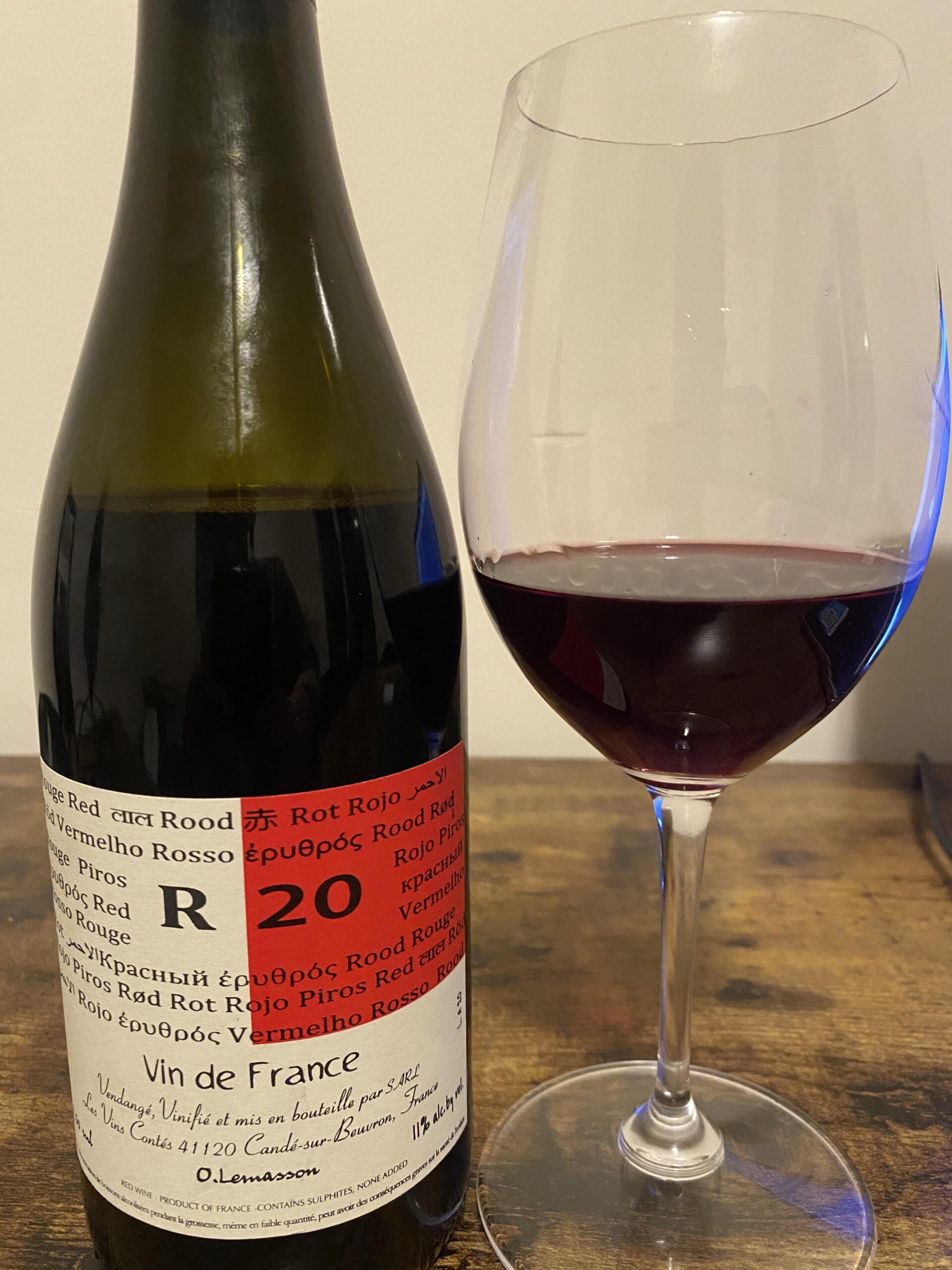 **Olivier Lemasson, VDF Rouge “R”:** Blend of Grolleau, Gamay, Cabernet Franc, and Cot. Whole-cluster, semi-carbonic maceration between 10 and 20 days with all the grapes co-fermenting. The wine is aged in fiberglass vats and then bottled early in the following spring after harvest. Purchased from Wine Therapy in Manhattan.