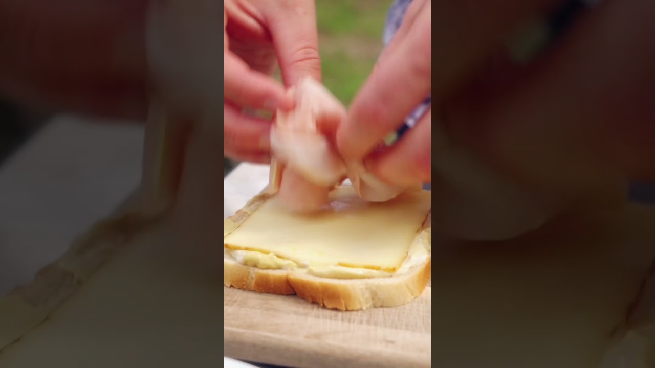 Beschmiert euch nebenbei 2 Sandwichscheiben mit Mayo und Senf und gebt erst den Käse und anschließend den Schinken darauf. Deckelt die beiden Brotscheiben nun mit 2 weiteren ab.