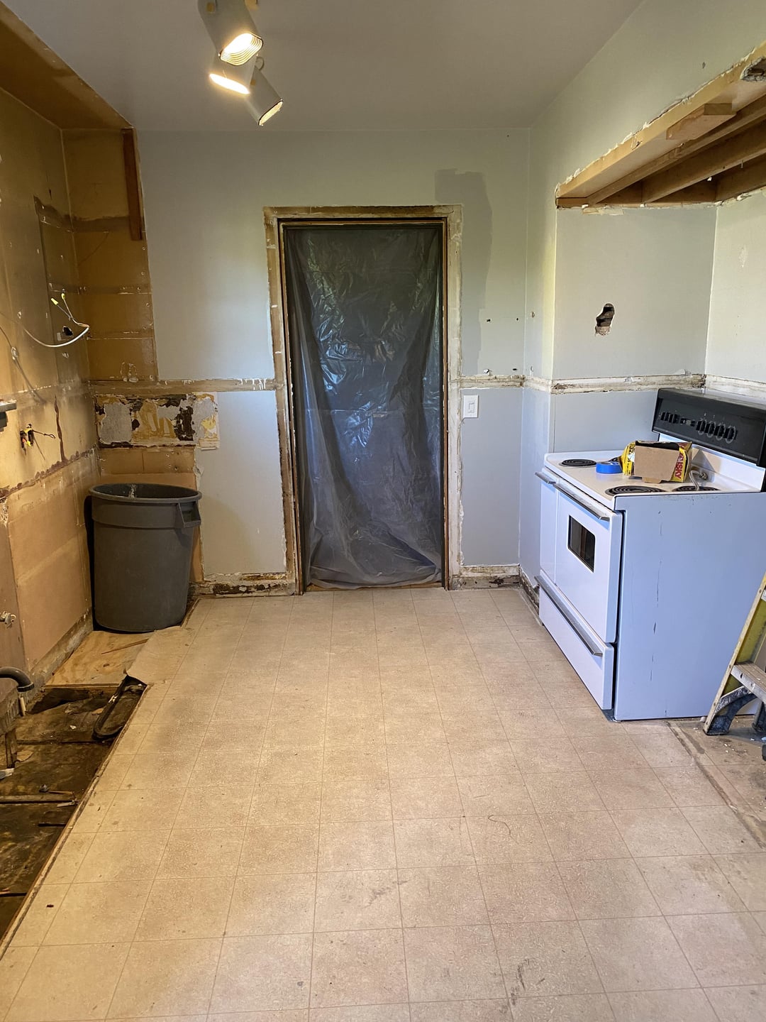 Builder here. Pry up that MDF subfloor with the linoleum. Resub with 3/4 class t&g osb. Ring shank into the joists. You can thank me in five years when your cabinets are still level and your countertop isn’t cracked at the sink. Ask me how I know.