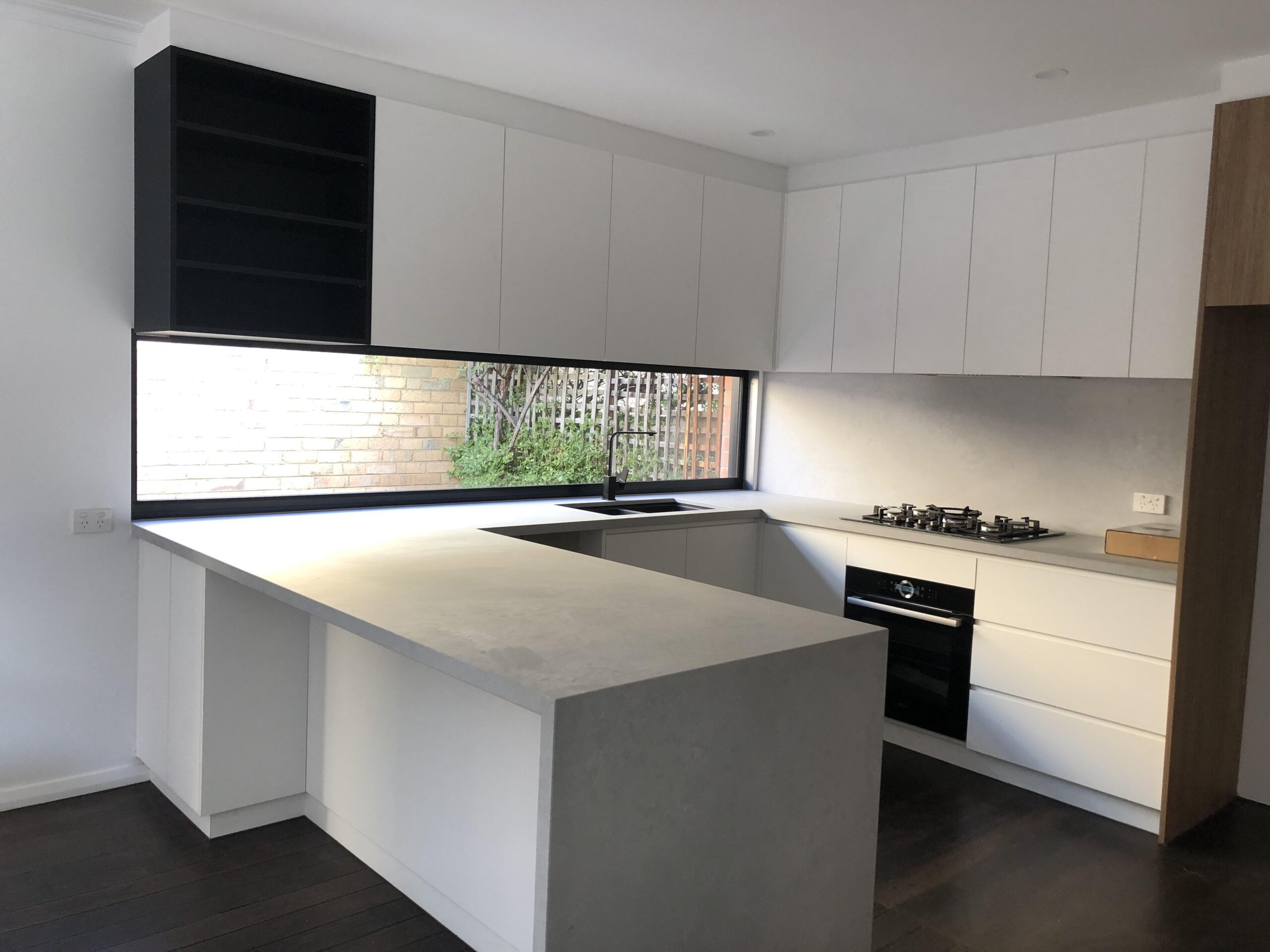 2. Why do you take the complete L-Form for your Uppercabinets? Now the whole room looks much smaller, because lesser light is coming in. There is only this Window. I know the kitchen ist white and it’s an open room but the darker Elements on the left and right. (The wood and the black)