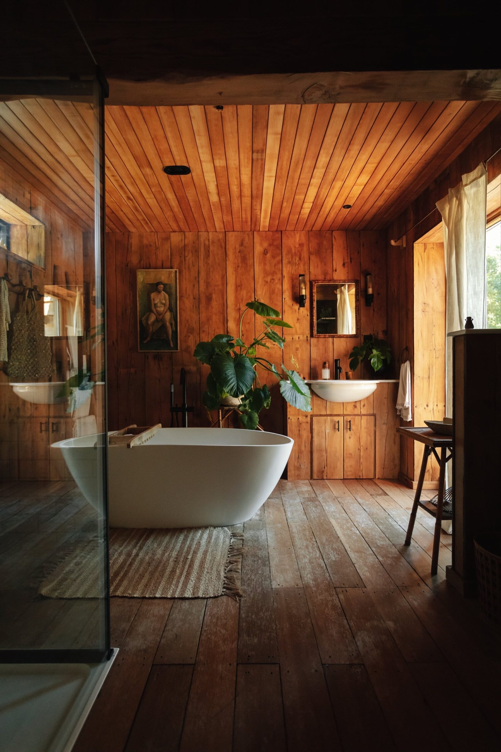 Timber-lined bathroom with a view in a lakeside cabin, Norfolk, East Anglia, England [2000×3000]