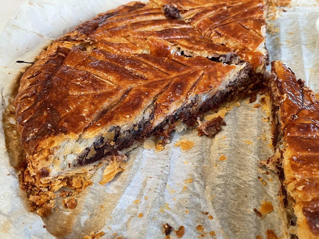 *frangipane avec 1/3 de crème pâtissière et 2/3 de crème d’amande + pépite de chocolat Valrhona 85% Guanaja et 2 CS de rhum infusé au cacao du Nicaragua.