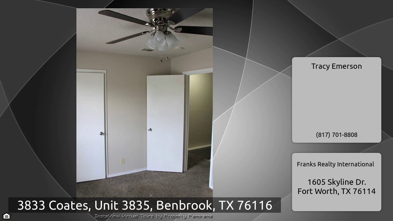 The Virtual Tour for the property at 3833 Coates, Unit 3835, Benbrook, TX 76116 listed for $1,050: Other homes for sale by Tracy Emerson of Franks Realty International: Beautifully updated townhouse with 2 bedrooms and full bath upstairs. First level has Living Room, Dining Room and Kitchen with range, refrigerator, dishwasher, garbage disposal & a brand new built in microwave. Half bath and laundry room downstairs. Updated kitchen, new luxury plank flooring and fresh paint throughout. Fenced in back patio has new french doors leading out to it. The townhouse is tucked away on a quiet cul …