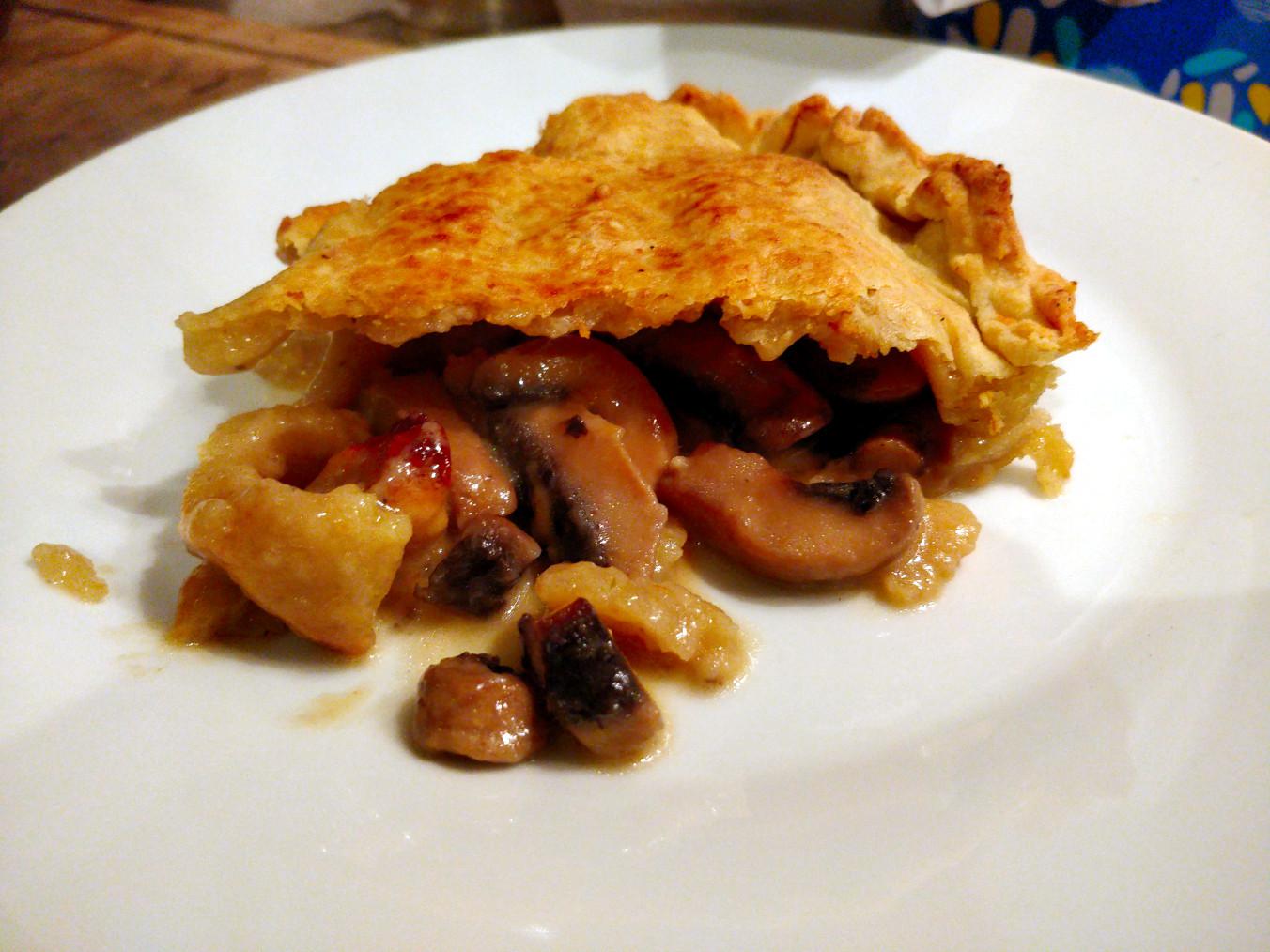 C’est en partie pour utiliser des restes : j’ai fait un bouillon avec la carcasse du chapon de Noël et quelques légumes; j’ai mis ces légumes dans la tourte avec les champignons, ainsi qu’un peu du bouillon… C’était délicieux 🙂