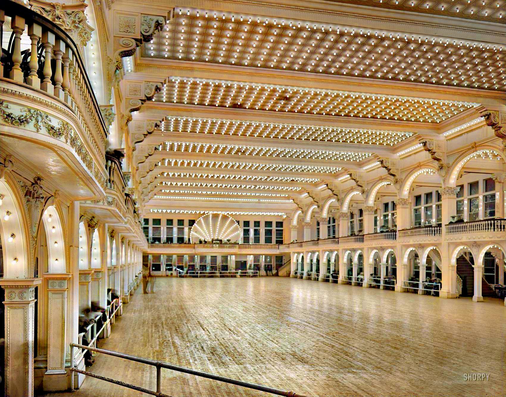 I wonder what the structure looked like, or was in just hardwood flooring over a slab, to support so many people dancing. Those grandiose old structures are so stunning. Like the Newport Mansions for example. Massive beams, steel out the wazzoo bc steel tycoons, massive slabs of marble and granite