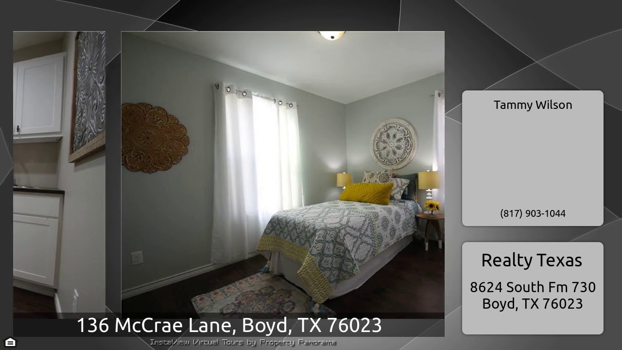 The Virtual Tour for the property at 136 McCrae Lane, Boyd, TX 76023 listed for $221,500: Other homes for sale by Tammy Wilson of Realty Texas: This modern Tudor style home sits on 2 acres. The charm starts with the inviting front porch. The living room has a beautiful custom coffered ceiling. Open concept living, dining and kitchen extends to an oversized built-in back deck accessible through French doors. Ample traditional cabinets are mixed with wood floating shelves in the kitchen where there is a large granite island with unique pendant lights. Functional laundry room with tons of …