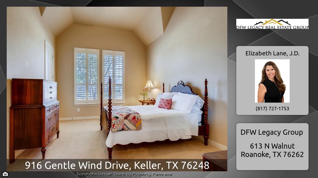 The Virtual Tour for the property at 916 Gentle Wind Drive, Keller, TX 76248 listed for $615,000: Other homes for sale by Elizabeth Lane of DFW Legacy Group: Built by Drees, this WATERFRONT 4 bed 4 bath home w custom updates in award winning Keller ISD, offers a functional floor plan including dedicated study w French doors, elegant dining room, chef’s kitchen overlooking family room, and master + 2 bedrooms down. 4th bedroom, full bath, game room w wet bar, and media room upstairs. Amenities include 12 ft ceilings with crown molding throughout first floor, plantation shutters, extensive …
