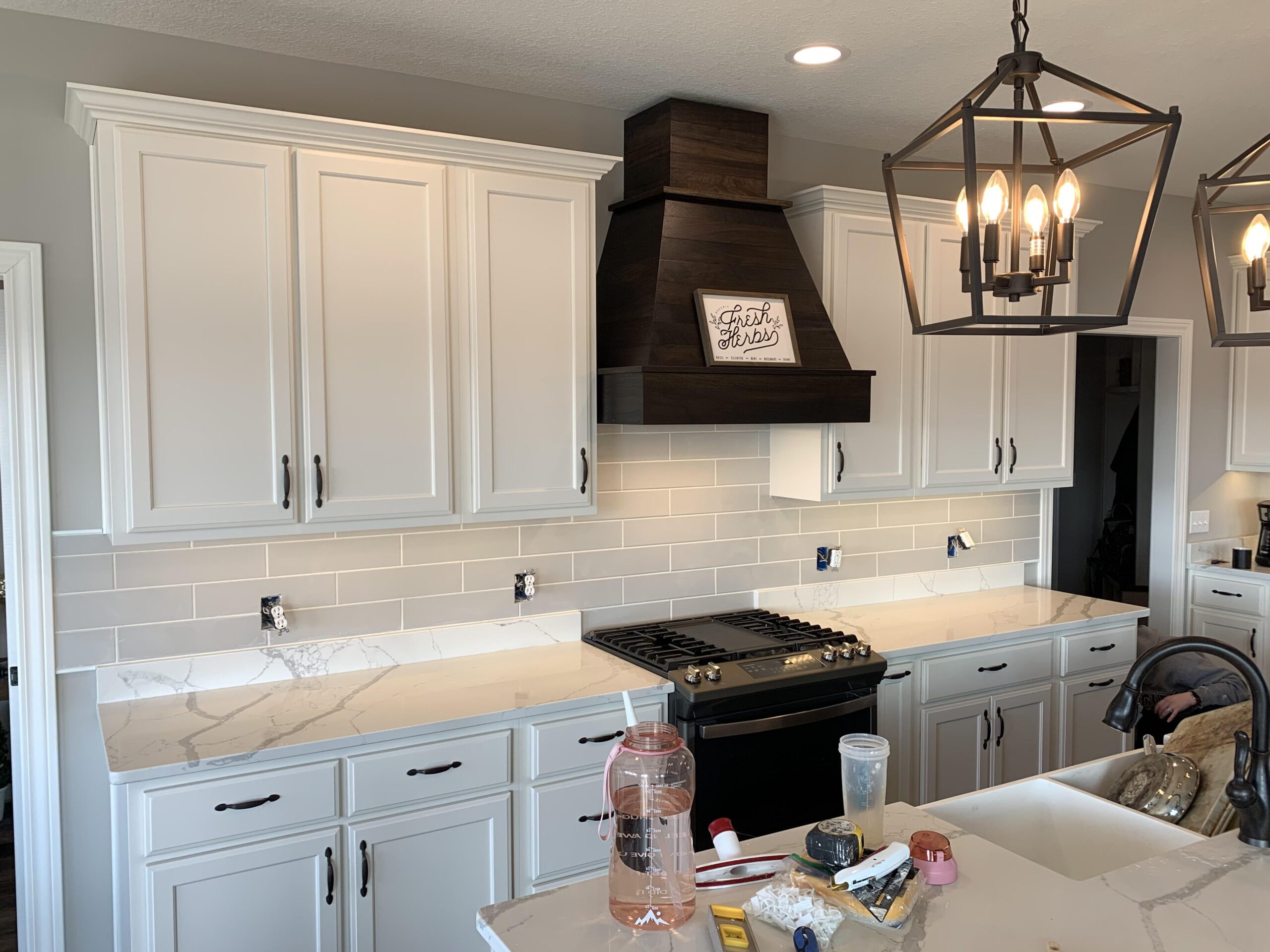 Looks great but I’d take that sign off the vent hood. Really breaks up the color.