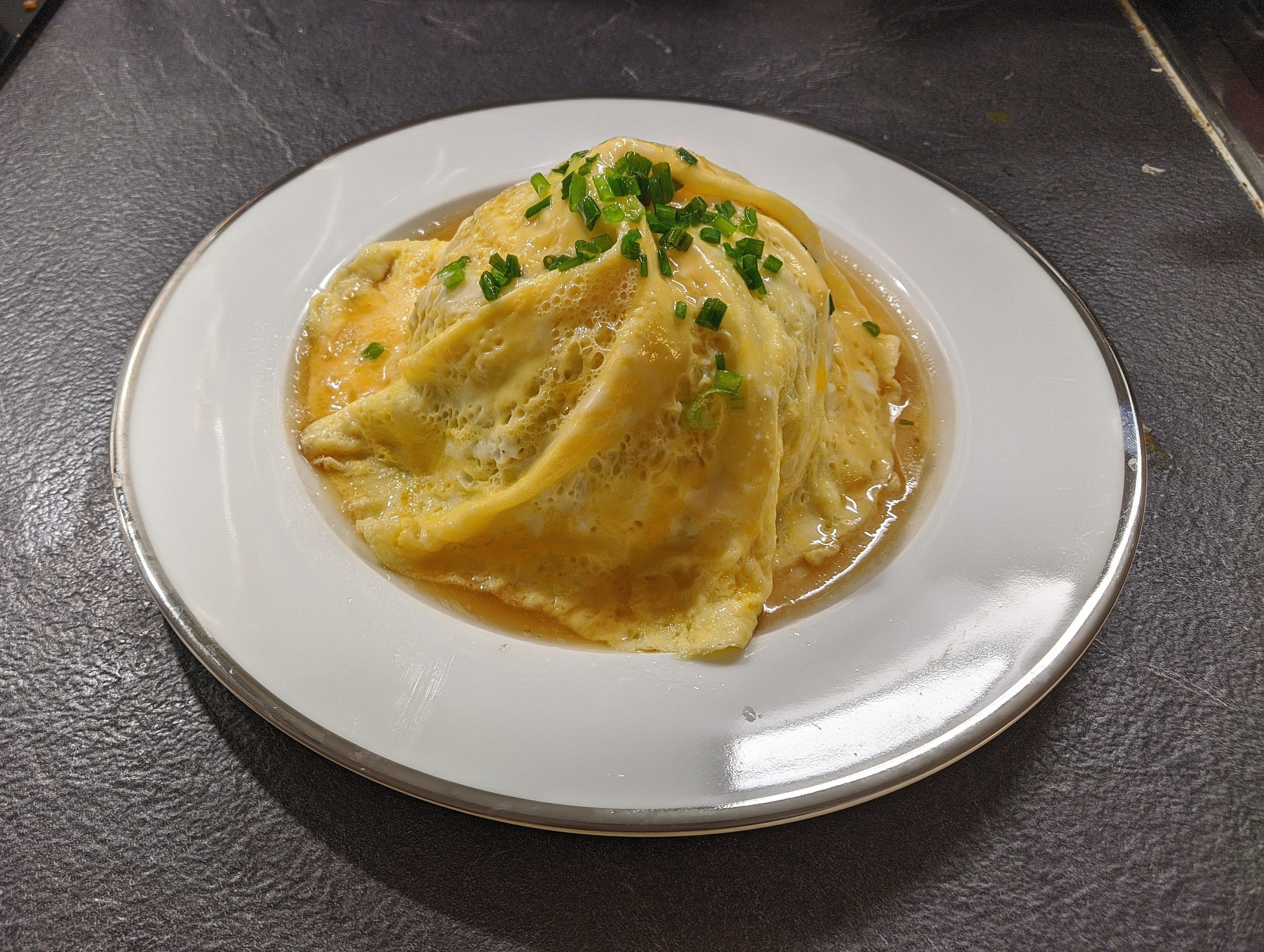 Je suis content car j’ai saisi la technique pour faire une tornado omelette. Et encore celle là n’est pas parfaite. Ça m’a demandé pas mal d’essais avant. En dessous de l’omette c’est du riz sauté. [Recette ici](https://reddit.com/r/afcm_lacuisine/comments/zd9sf7/riz_saut%C3%A9/).