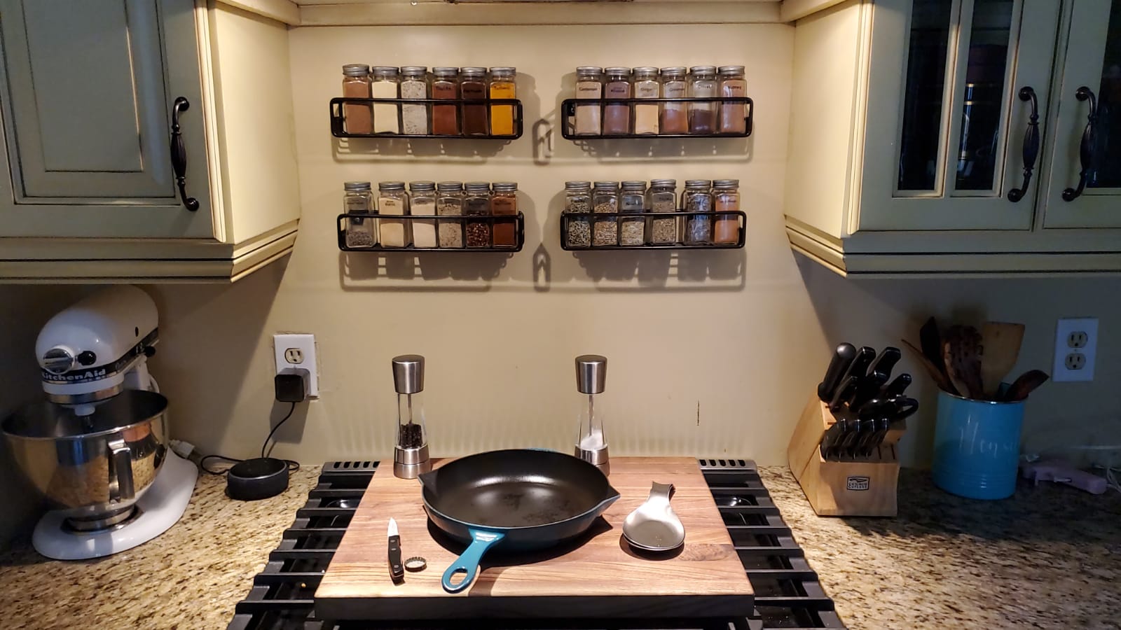 2. TBH, that seems like a terrible placement for a spice rack. The glasses will be greasy in no time…