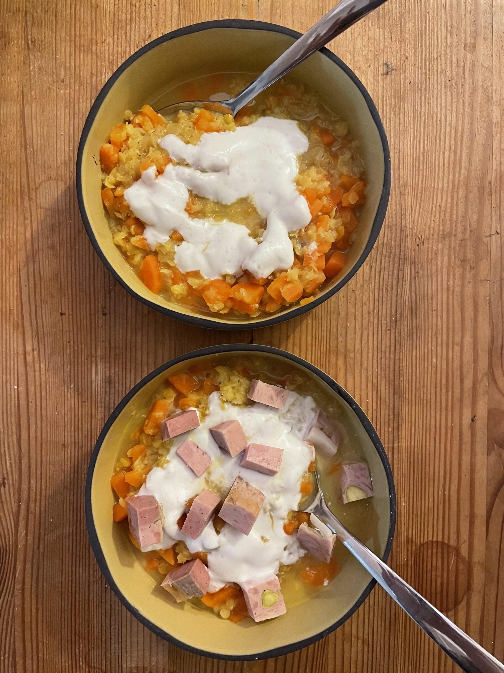 Faire revenir oignons et carottes. Mettre les lentilles dans 3 volumes d’eau pour un volume de lentille. Rajouter les épices. Laisser cuire 10-15min. Rajouter un trait de crème de coco. C’est prêt !