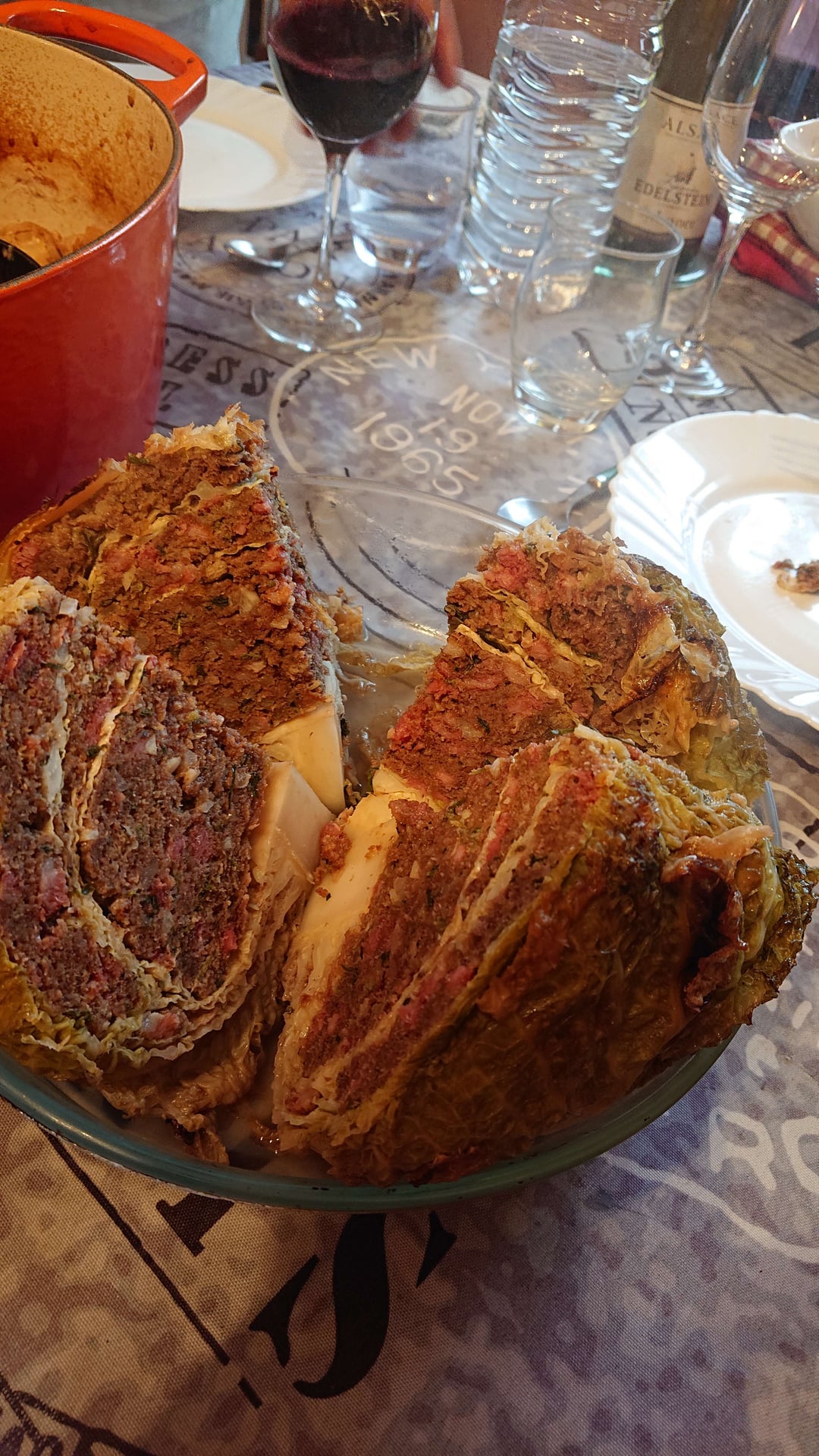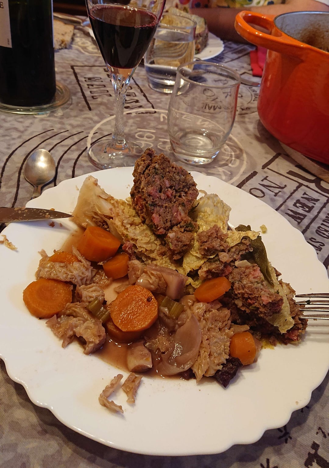 Pour la farce: 600g de boeuf haché 300g de lard fumé 3 oeufs 1 branche de céleri 2 échalotes Ail au goût Chapelure de pain au jugé (afin d’avoir une texture convenable) Sel, poivre, sauge, persil.